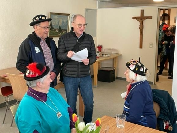 Er war sehr angetan über ein fast familiäres Miteinander beim täglichen Mittagsmenü. Spontan bedachte er diese soziale Einrichtung mit einer persönlichen Spende. Die Bad Waldseer Heimatdichterin Charlotte Moser (rechts) freute sich riesig, dass Löffler ihr aktuelles Fasnets-Gedicht zum Besten gab.
