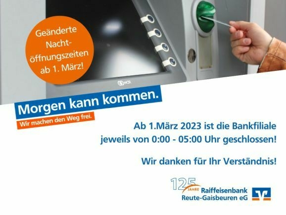 Gaisbeuren - Ab dem 1.März ist die Bankfiliale von 0:00 bis 05:00 Uhr komplett geschlossen. Ein Zugang zum SB-Bereich ist in dieser Zeit nicht möglich.
