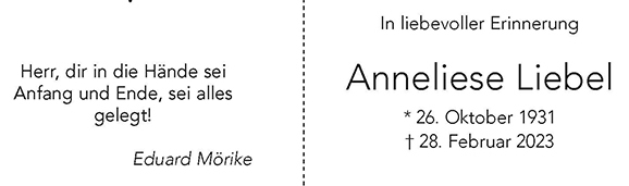 Jahrzehntelang standen im Impressum der Lokalausgabe Bad Waldsee die Worte: „A. Liebel, Anzeigenleitung“. Was sich hinter diesem Eintrag verbarg, war eine souveräne und gleichermaßen bescheidene Dienstleistung. Pflichtbewusst und zuverlässig diente sie ihrem Verlag und damit ihrer Stadt. Selbstverständlich war sie bei Todesfällen auch am Wochenende oder außerhalb der Geschäftszeiten erreichbar. Mit Feingefühl und Kompetenz beriet sie die Trauerfamilien und mit größter Akkuratesse prüfte sie die gesetzten Todesanzeigen. Mit Fug und Recht darf man behaupten, dass in den Jahrzehnten ihrer Anzeigenleitung nie ein Setzfehler in einer Todesanzeige auftauchte.