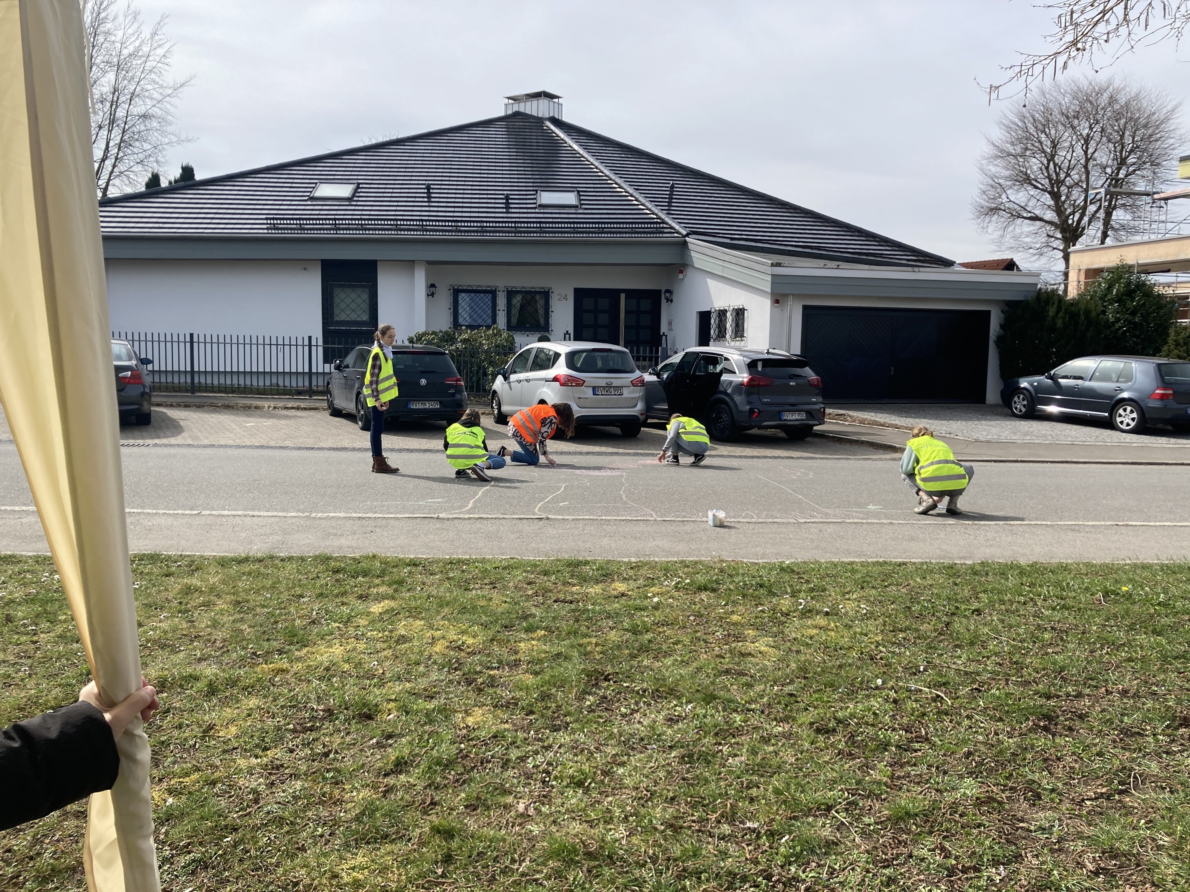 Der Rotkreuzweg und der Wolpertsheimer Weg blieben so morgens ab 7 Uhr und mittags ab 11.20 Uhr für jeweils ca. 90 Minuten vom Autoverkehr verschont und boten den Radfahrern und Fußgängern entspannte letzte Meter auf dem Weg zur Schule. Die Gelegenheit, die leere Straße mit Malkreide großflächig zu verschönern, ließen sich die AK-Mitglieder nicht entgehen. Auch ein gemeinsames Frühstück auf der Straße durfte nicht fehlen.