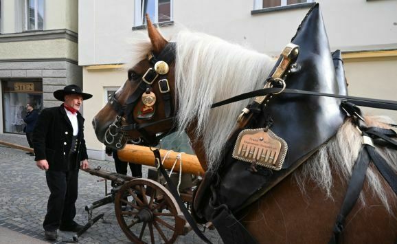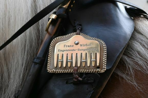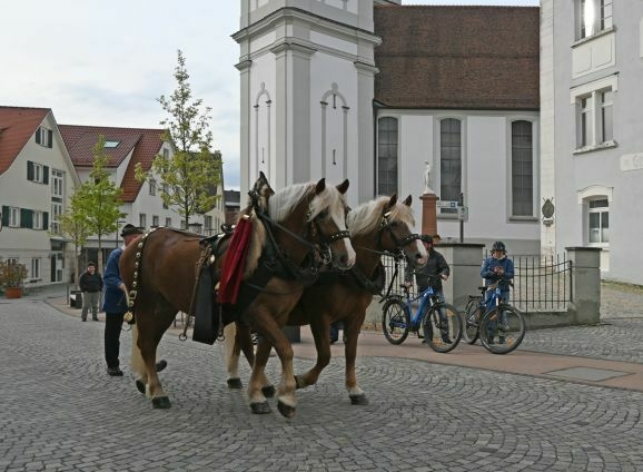 Erstmal: warten. Der Baum still auf seiner Lafette am Gut-Betha-Platz. Die Zimmerleute der Jungelfertruppe schon mit dem einen oder anderen „Steinacher Helles“ ausgestattet. Der Fanfarenzug in blau und weiß. Ein paar versprengte Zuschauer. Plötzlich der Ruf: „Die Gäule sind schon an der Ölmühle.“ Und da kommen sie auch schon. Zwei schöne, schwere Pferde. Braunes Fell, blonde Mähnen und Schweife. Festlich herausgeputzt mit glänzendem Geschirr. Blank gewienertes, hochglänzendes Kupfer an Zaumzeug und Kummet. „Franz Wirbel, Engenreute-Bergatreute“ steht auf dem Messingschild.