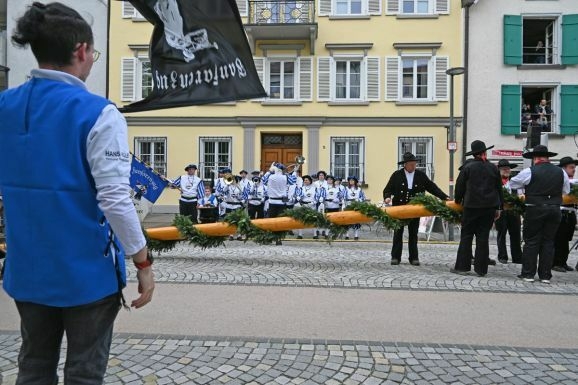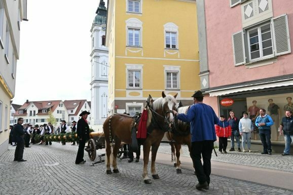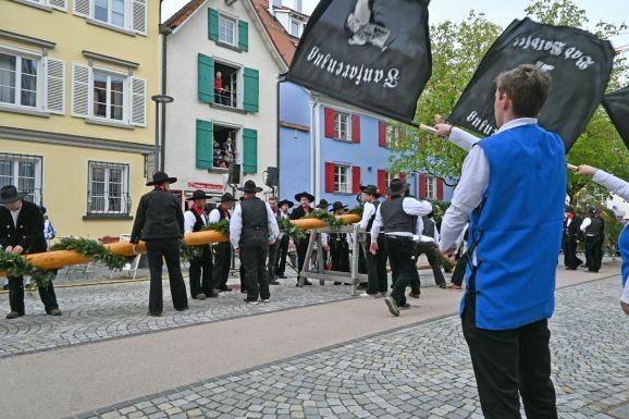 Umsichtig und ohne Hast und Hektik spannen die beiden Fuhrleute in ihren blauen Kitteln die Pferde vor den Baum. Die Fanfaren schmettern, die Trommeln wirbeln, die Fahnenschwenker schwenken, so geht’s hinein in die Stadt. Am Rathaus vorbei wird der lange Stamm vorsichtig in die Ravensburger Straße bugsiert. Begleitet von vielen Zuschauern durch die Ravensburger Straße, über den Ravensburger Torplatz, in die Hauptstraße und dann einschwenken auf die Hochstatt.
