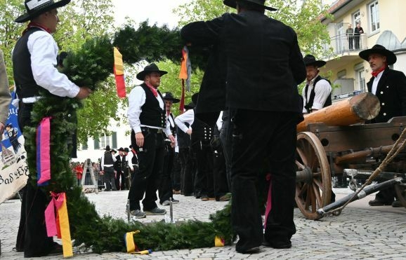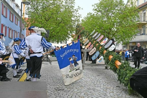 Solange die Zimmerleute werkelten, rief Barny Bitterwolf unter großem Applaus Oberbürgermeister Matthias Henne auf die Bühne. Der bedankte sich bei seinen Bad Waldseern für den Empfang, bei Bitterwolf für die Moderation und beim Fanfarenzug für die schmissige Musik. Ein besonderer Willkommensgruß galt den Jungelfern, die für das Stellen des Baumes zuständig waren und der Volkstanzgruppe aus Winterstettendorf.