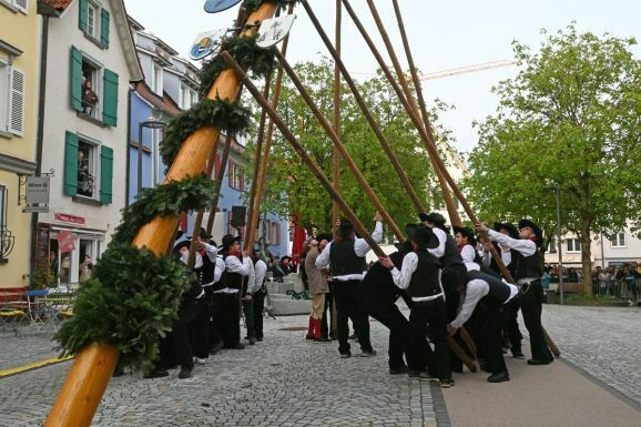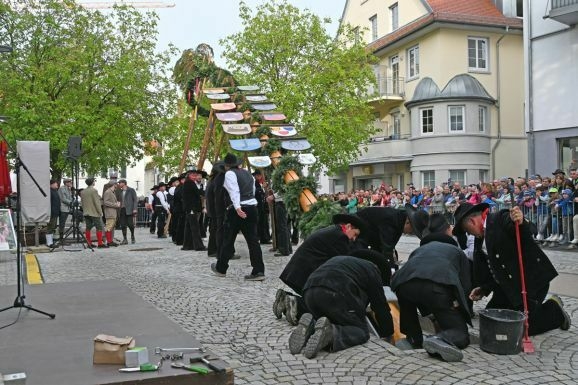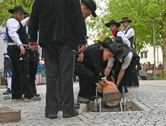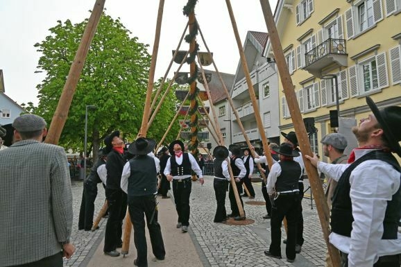 Bad Waldsee - Hochstatt, 30. April: Um 19.24 Uhr flutscht der Maibaum mit einer letzten Kraftanstrengung der Zimmerleute in seine Bettung und reckt sich sogleich aufrecht 28 Meter in den ziemlich blauen Frühlingshimmel. Aber vorher gab’s einiges zu tun.