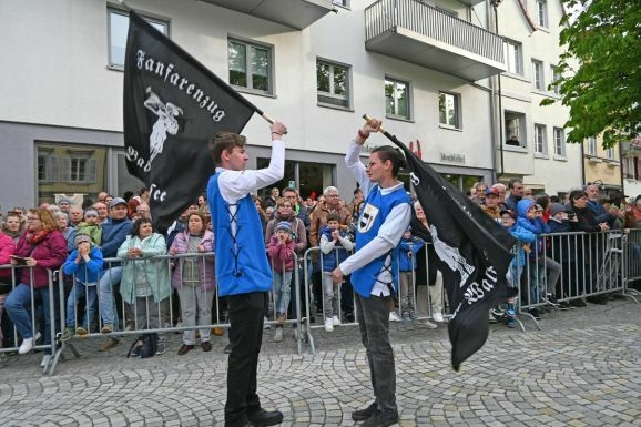 Rund um die Sicherheitsabsperrung warten vier-, fünfhundert Schaulustige auf die Ankunft des Baums. Angefeuert von Moderator Barny Bitterwolf wird der Baum mit seiner Begleitung mit einem lautstarken „Bad Waldseer“ Applaus empfangen. Mit Fanfarenschall und Trommelklang bezieht der Fanfarenzug Stellung vor dem Haus Mayer.