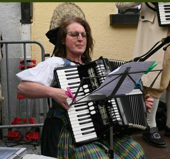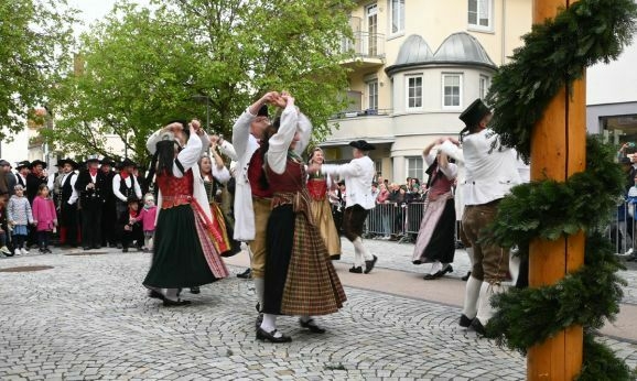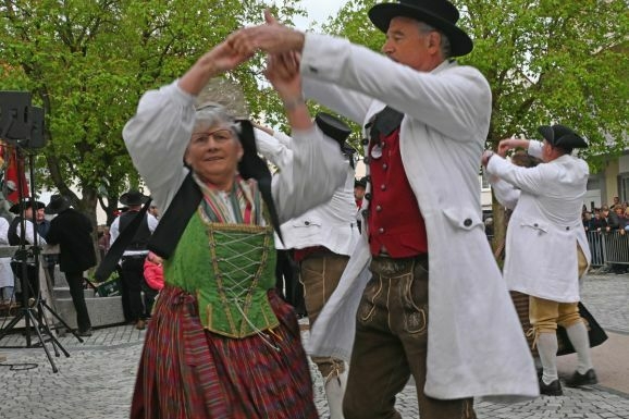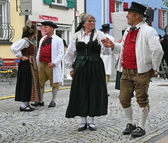 Hübsch aufgestraußt in ihrer oberschwäbischen Bauerntracht aus dem Ende des 18. Jahrhunderts, traten die Tanzpaare an. Die Frauen mit kunstvoll geschnürten und bestickten Miedern, weißen Blusen, langen Röcken mit vorgebundener Schürze und zierlichen Radhauben mit langen Schleiern im Haar. Die Männer mit weißen, leinernen Gehröcken, roten, goldgepunkteten Westen, Lederbundhosen, Kniestrümpfen und Schnallenschuhen. Den Kopf bedeckt mit Dreispitzen oder einer Art Zylinderhut. Begleitet vom Akkordeon gaben sie mit drei Tänzen einen kleinen Einblick in die Welt der Trachten und des Volkstanzes von anno dazumal.