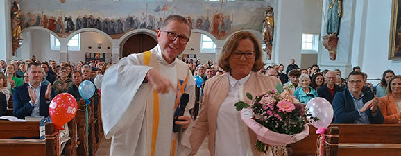 Zum Abschluss des feierlichen Gottesdienstes galt es noch, Erzieherin Erna Hausch für 42 Jahre Einsatz im Kindergarten zu danken. Unter großem Beifall der Kirchenbesucher überreichten Franziska Tessling als Gewählte Vorsitzende des Kirchengemeinderats und Pfarrer Bucher der bei Kindern und Eltern allseits beliebten „Erna“ ein Blumengebinde.
