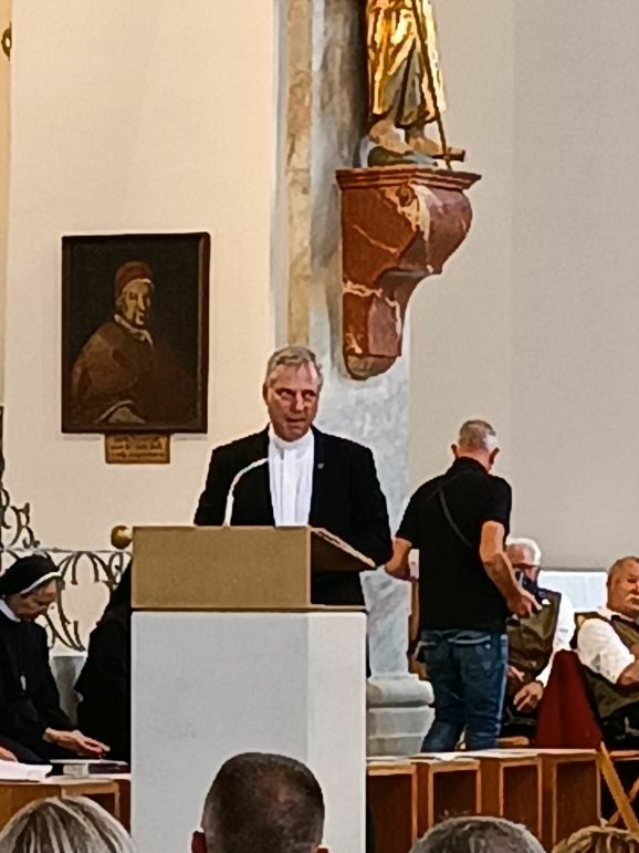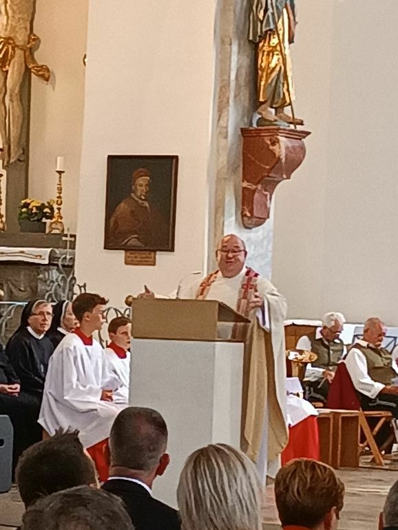 Den Festgottesdienst feierte Domkapitular Thomas Weißhaar in Konzelebration mit den Pfarrern Thomas Bucher, Ulrich Steck und Martin Sayer. Seine kurze prägnante Predigt endete Weißhaar mit dem Satz: „Das Leitwort ‚Gott in der leidenden Menschheit zu dienen‘ erfordert jeden Tag neue Zivilcourage.“