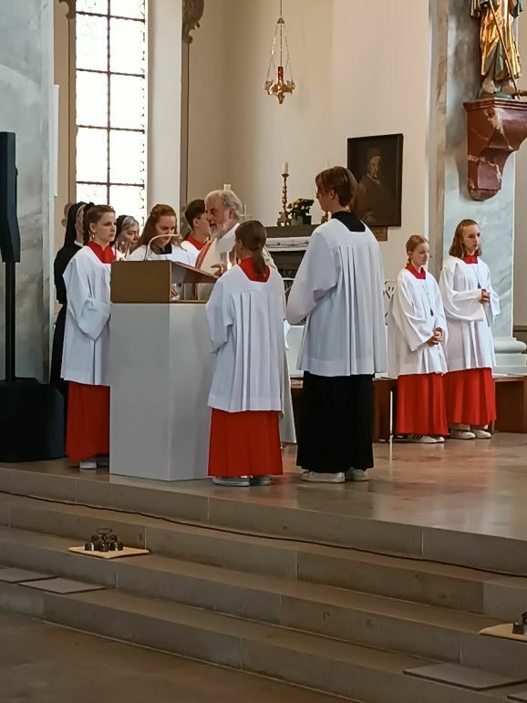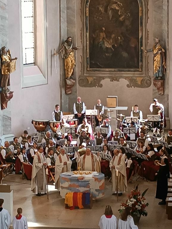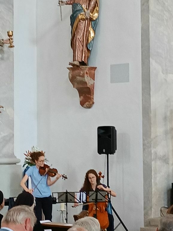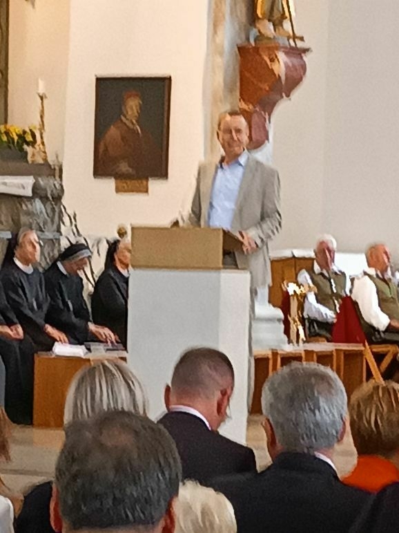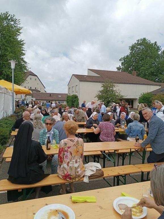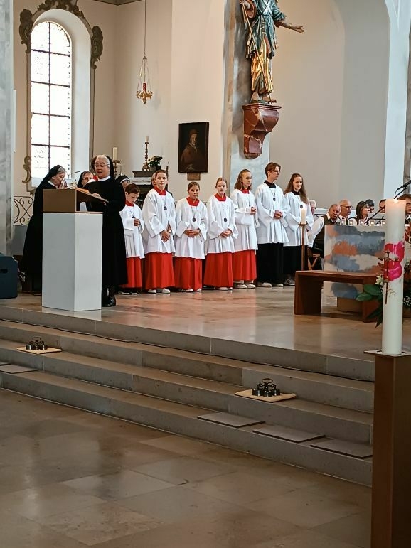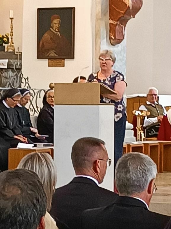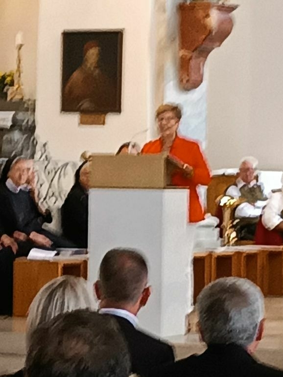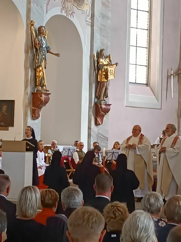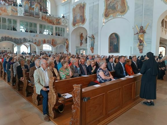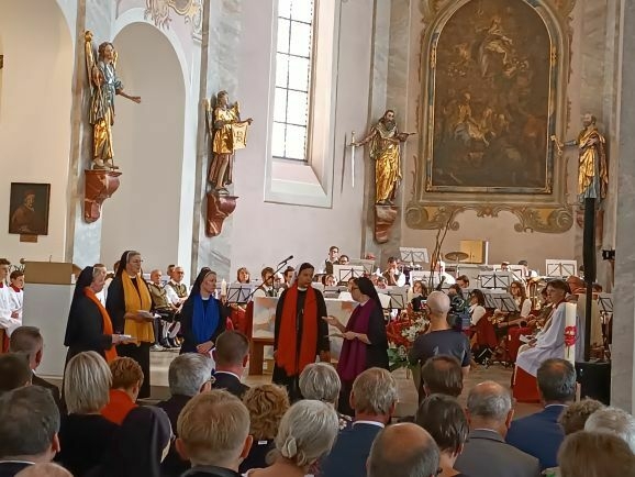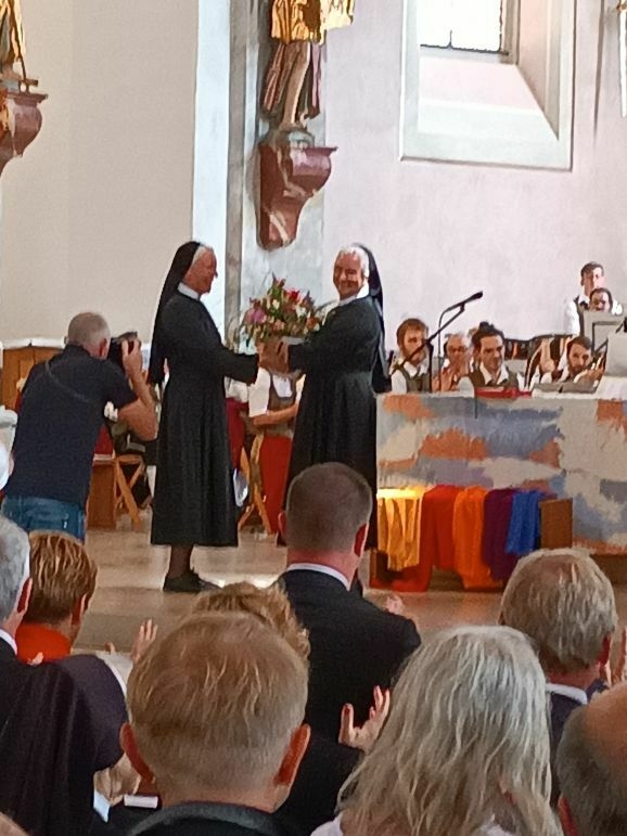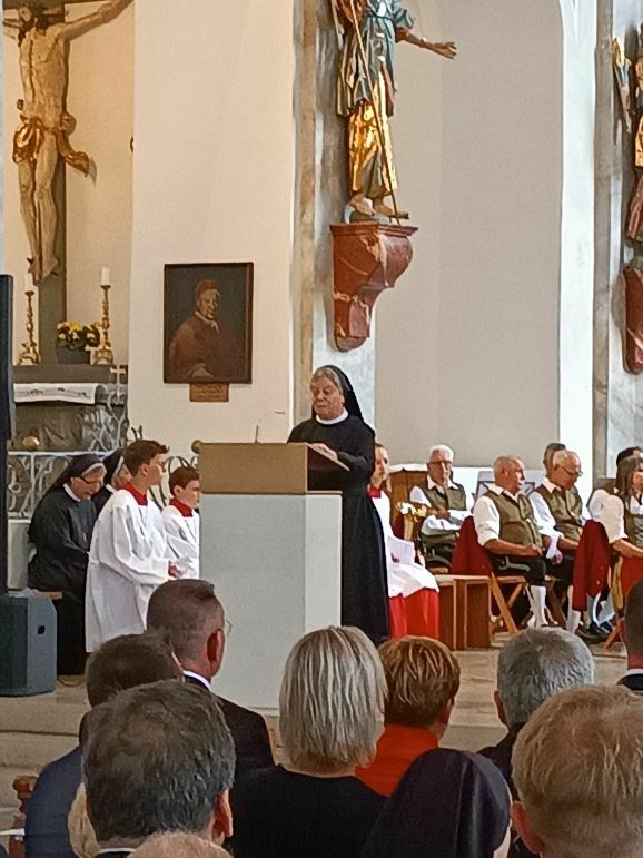 Mit großer Freude und berechtigtem Stolz eröffnete Generaloberin Schwester Maria Hanna das Fest „175-Jahre-Zukunft“. Gekommen waren Repräsentanten aus Kirche und Politik, Vereinen und Organisationen. Der Musikverein Marbach gab dem Gottesdienst ein besonders festliches Gepräge, Schwester Birgitta hat somit ihre Heimat-Musikkapelle mit ins Boot genommen. Die Geschwister Magdalena und Johanna Renner, als Kinder schon bei Familien-Gottesdiensten mit dabei, spielten Geige und Cello. Schwester Franziska glänzte als Kantorin.