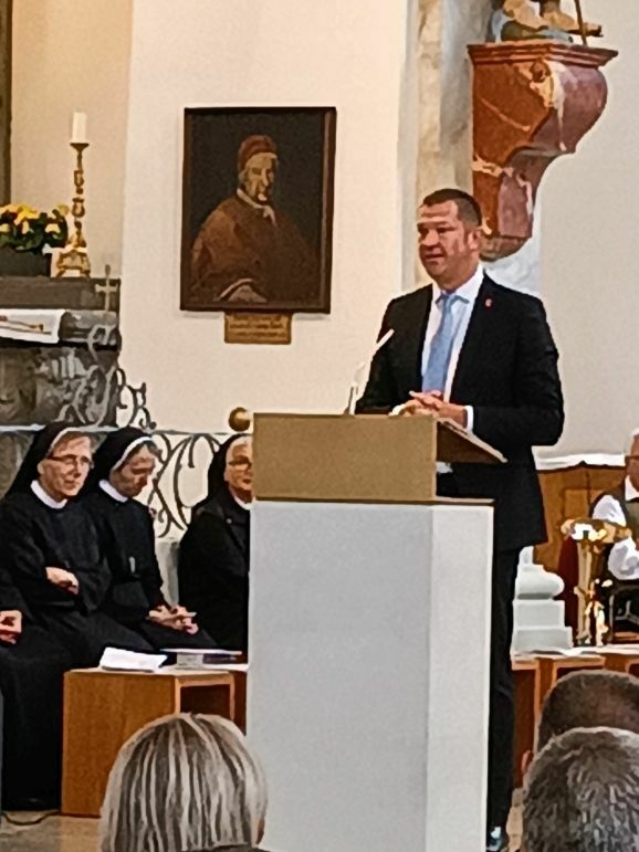 Ehinges Oberbürgermeister Alexander Baumann überbrachte die Grüße der Stadt Ehingen: „Wir sind stolz, dass es Frauen aus Ehingen waren, welche zunächst von ihren Elternhäusern aus arme und verlassene Menschen pflegten. Sie überbrückten familiäre Notlagen, indem sie für erkrankte Mütter einsprangen, Haushalt und Kinder versorgten.