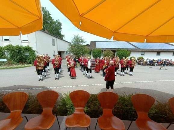 Mit der Musikkapelle Marbach voran ging es um 13.00 Uhr den Klosterberg hinunter zum gemeinsamen Mittagsmenü. Dieses servierten die Reutener Landfrauen zusammen mit dem Obst- und Gartenbauverein den jetzt noch in größerer Anzahl gekommenen Gästen im Zelt und Obstgarten.