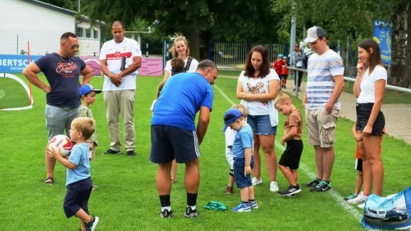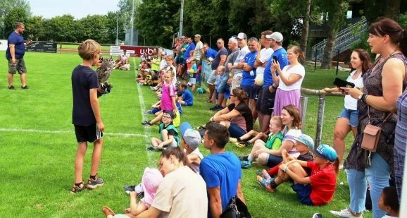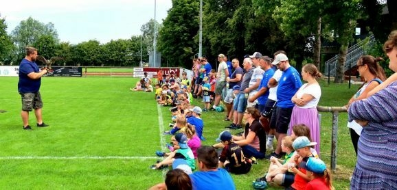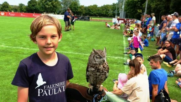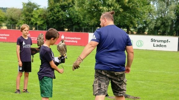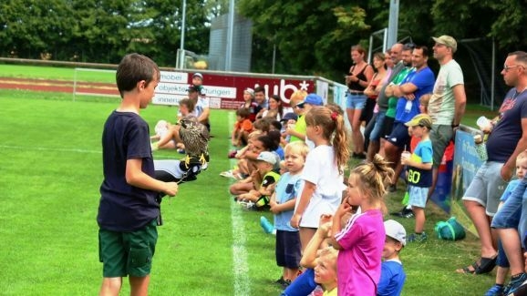 Wie schon vergangenes Jahr ermöglichte Falkner Daniel Paulat (Haidgau) den Kindern und begleitenden Eltern einen Einblick in die Lebenswelt von Greifvögeln. Den Vorführungen und Erklärungen des Falkners und seiner fußballbegeisterten Söhnen wurde nach der anschaulichen, naturkundlichen Demonstration viel Applaus gespendet.