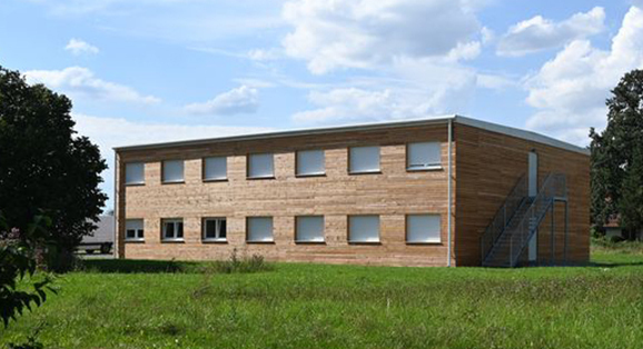 Betritt man das neue Gebäude, steht man in einem weiß getünchten Flur, von dem rechts und links gleiche Türen abgehen. Klar, alles ist neu, aber doch sehr einfacher Standard. Macht man die Türe zu einem der Zimmer auf, sieht man auf den ersten Blick, dass die Geflüchteten kein Luxus, sondern eine einfache, zweckmäßige Unterbringung erwartet. Laut Gesetz steht jedem Geflüchteten 4,5 qm Raum zur Verfügung. Jedes der schmalen Zimmer ist deshalb mit drei Betten, davon zwei Stockbetten, einem Schrank und einem Tisch mit drei Stühlen eingerichtet.