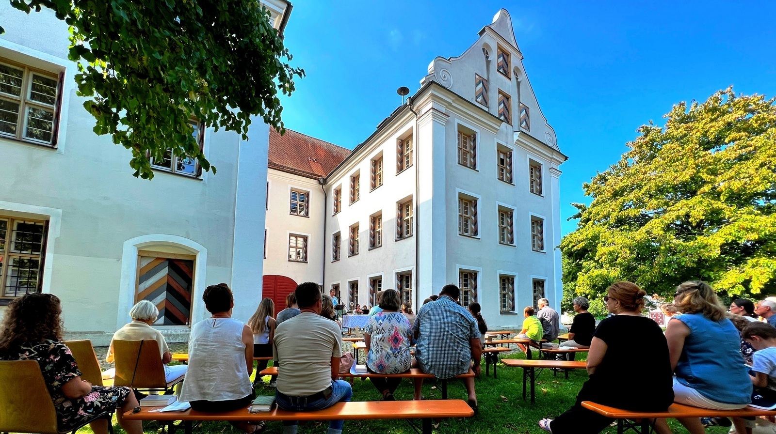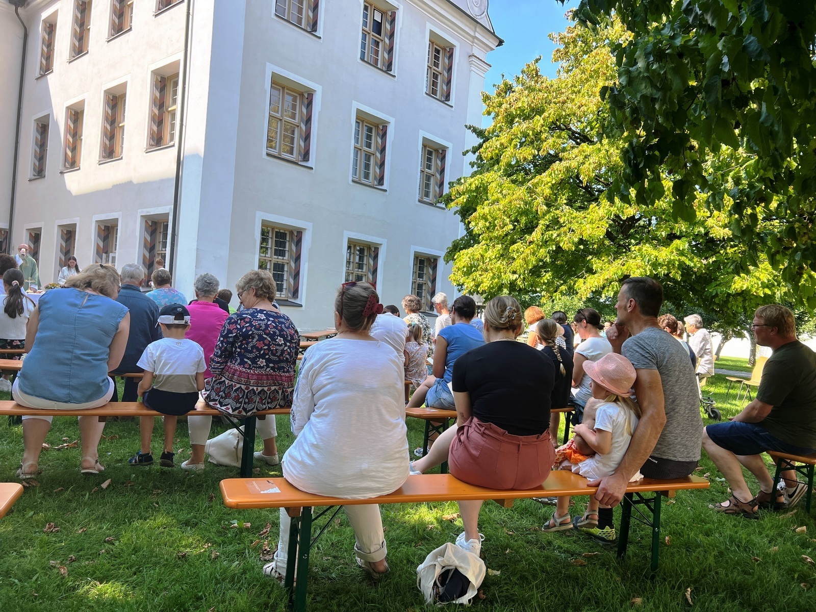 Die Plätze unter den schattenspendenden Lindenbäumen waren gefragt. Über allem wölbte sich ein blaues Firmament.