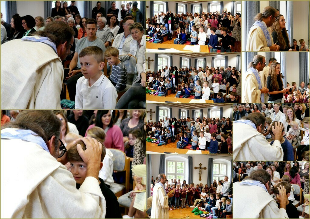 Mit Gebeten, Bibeltexten, Fürbitten, vorgetragen von Eltern und Lehrkräften,, religiösem Liedgut, professionell begleitet am Klavier durch die Schulleiterin Angelika Zimmermann, wurde der Wortgottesdienst zu einer Bereicherung für alle Anwesenden. Pfarrer Werner machte deutlich, dass alle zu Gottes Familie Kunterbunt gehören. Jedem Schulneuling legte er dann die Hände auf und erbat Gottes Segen für alle. Dazu erhielt jedes der Kinder ein hilfreiches Segensband von ihm.