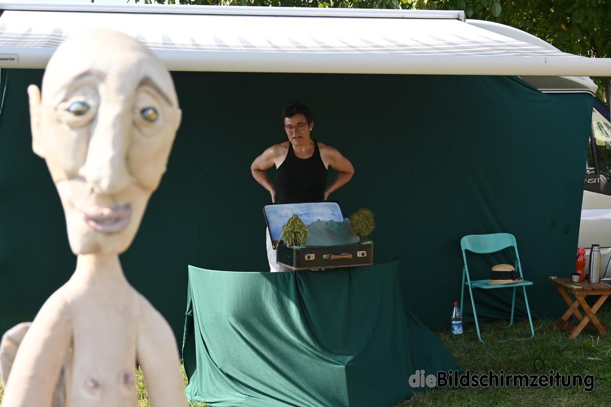 Am Ortsausgang Gwigg bekomme ich grade noch den Schluss mit beim Faro-Theater von Veronika Degler. In einem kleinen Koffer liebevoll dekoriert steckt ein mit Himmel und Wolken bemalter Hintergrund. Rechts und links flankiert und begrenzt von zwei kleinen Bäumchen. An dünnen Führungsstäben dirigiert Veronika Degler zwei kleine Schäfchen mit ihrem Schäfer über die winzige Bühne im Koffer. Völlig in ihren Bann hat sie einen kleinen Jungen gezogen, der sich, Fahrradhelm noch auf dem Kopf, an seinen Vater schmiegt. Dass sie es auch mit größeren Figuren kann, zeigen mannshohe skurrile Puppen.