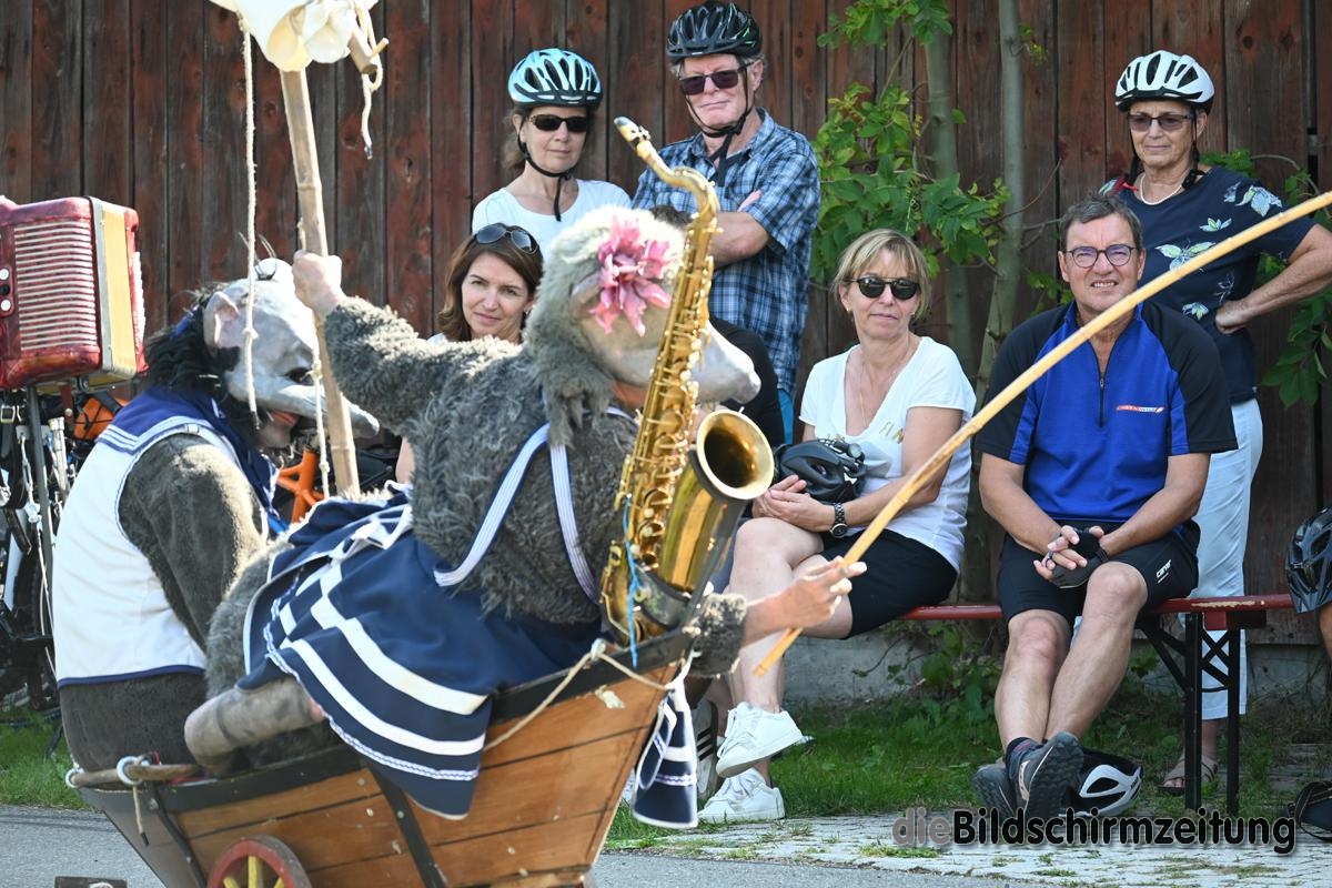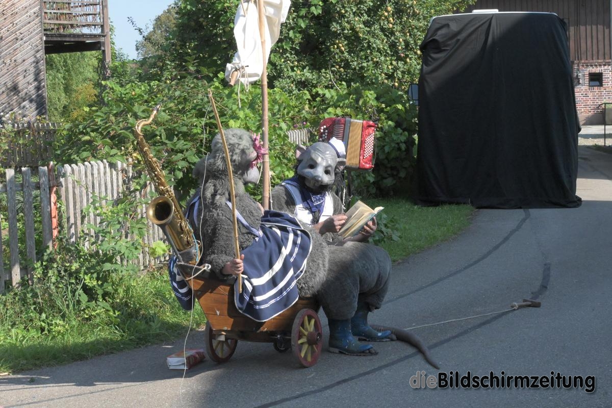 Die B 30 überquerte ich mit einer Gruppe Radler an der Fußgängerampel vor dem Hotel Adler. Traurig hingen die blauen Stoffbahnen vom Bagger: Vorstellung erst in einer halben Stunde. Solange warten? Dann fahr ich doch einfach weiter nach Tannweiler, zu Paspartout. Viel Publikum ergötzte sich am tierischen Spiel mit Landratten ahoi.
