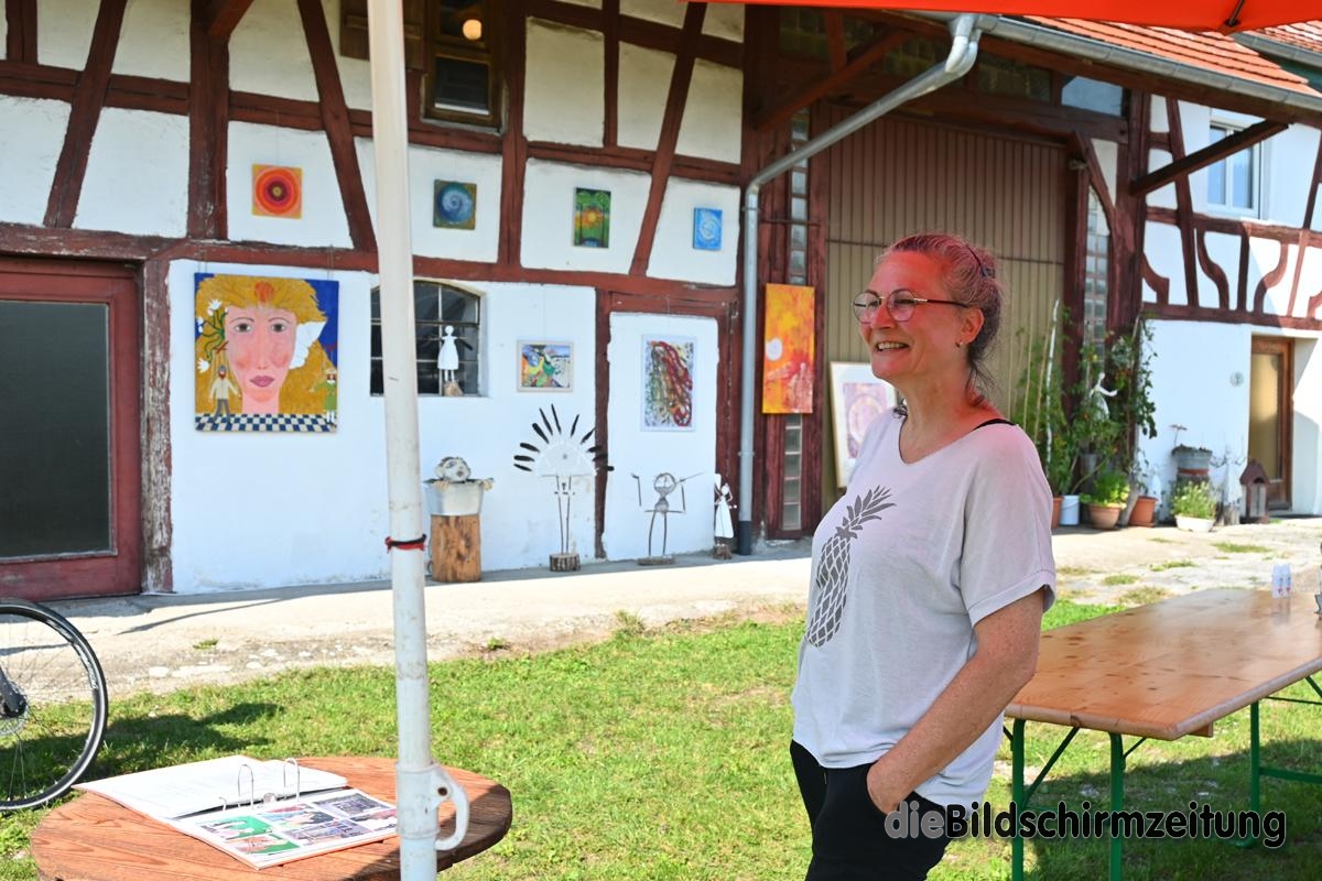 Wenn man erst mal von der L 316 nach rechts Richtung Gwigg abgebogen ist, präsentiert sich Oberschwaben als reinste Idylle. Auf der Höhe thront die Volkertshauser Kapelle mit ihrem grün belaubten Baum vor einem blauen Himmel, auf dem ein paar weiße Wolkenschiffe dahinsegeln. Zu ihren Füßen grast friedlich eine Herde gefleckter Kühe. Vom nahen Hof bellt ein Hund. Ein Traktor rumpelt aus der Einfahrt. Im Pferch schnattern Gänse. „Nicht mehr lange“ denk ich, „dann seid ihr als Martinsgans auf dem Tisch.“ Kurze Wege, großer Genuss. Und statt Hafermast in Polen haben sie in Oberschwaben doch ein beschauliches Leben auf der Wiese, am Bach. Ja, in dieser Welt lebt eben der Eine, indem er den Anderen frisst. Mit solchen tief philosophischen Gedanken radle ich dahin, bis mich ein spät pubertierender Cabriofahrer mit lautem Auspuffgedröhne überholt. Radlerverschrecken heißt das Spiel. Und dann bin ich auch schon an der Kunstausstellung von Regine Hirsch in Gwigg.