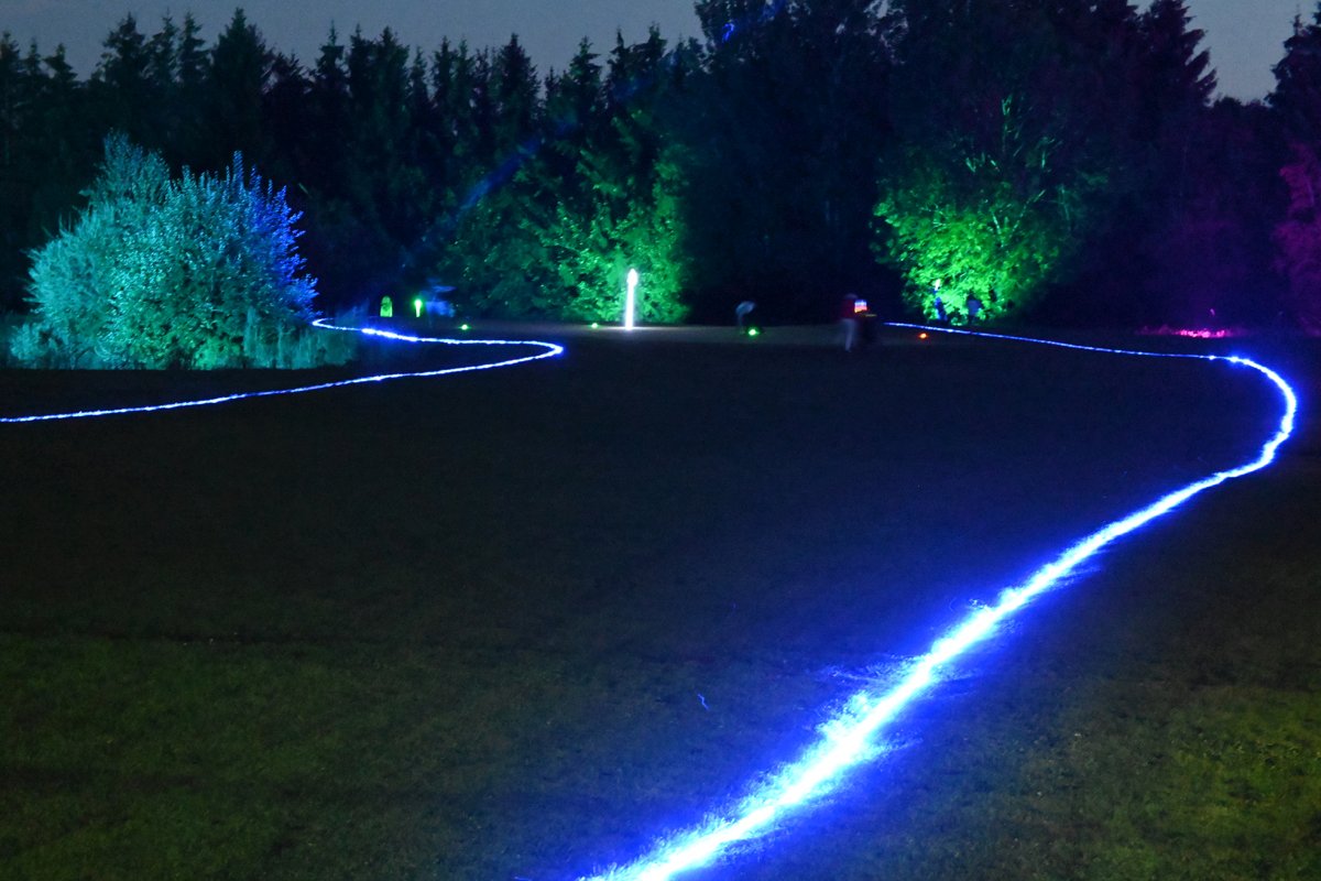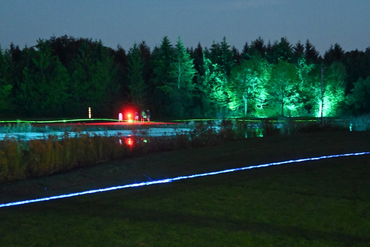 Die LED-Nachtgolf-Anlage umfasst die 6 Bahnen um den See des Kurzplatzes. Sie sind nicht wie ein Fußballstadion taghell mit Flutlicht bestrahlt. Dezente Leuchtbänder aus hunderten LED-Leuchten rahmen die Fairways ein. Auch die Peripherie wird mit der sanften LED-Beleuchtung angestrahlt, so dass eine zauberhafte Stimmung entsteht, die auch Spaziergänger beeindruckt.