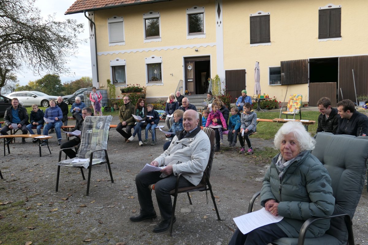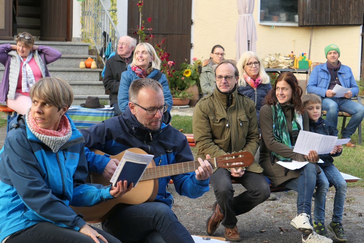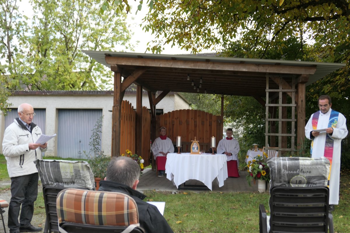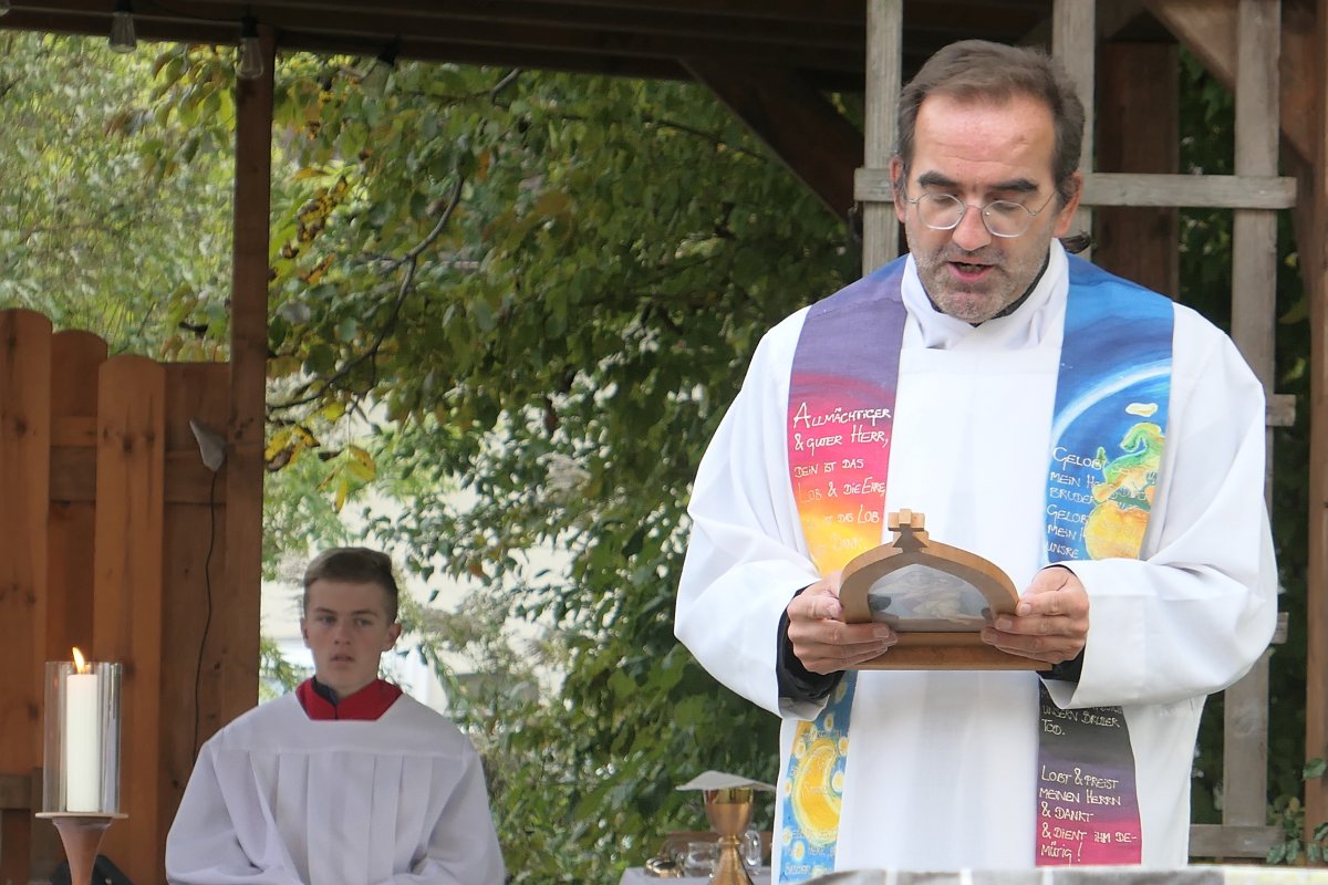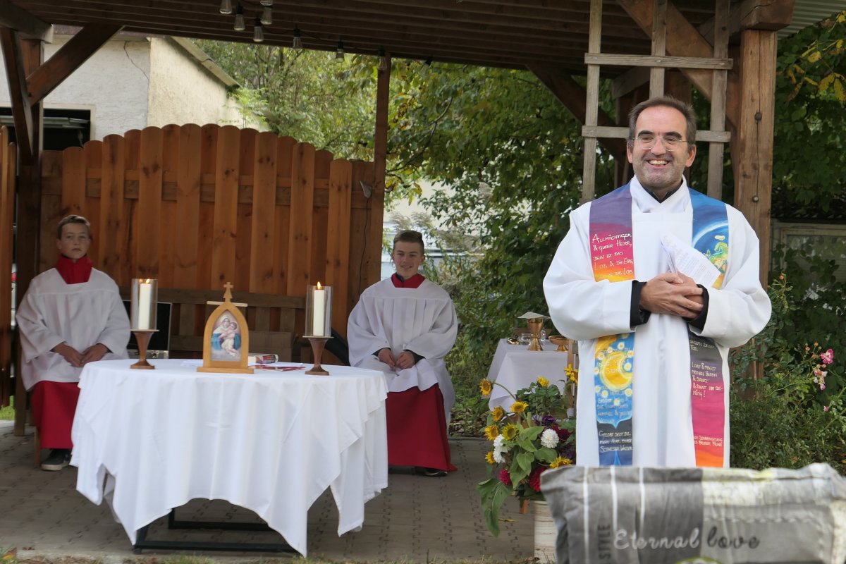 Bei angenehmer Herbsttemperatur fanden sich am frühen Sonntagabend gut 40 Gläubige im Tobelweg bei der Großfamilie Schmid ein. In ausreichendem Abstand standen genügend Sitzgelegenheiten zur Verfügung. Den Altar unter einem mächtigen Nussbaum schmückte neben herrlichen Blumen das Bild der „Der Pilgernden Gottesmutter von Schönstatt“. Seit dem Jahr 2011 ist diese, in Brasilien vor einigen Jahrzehnten initiierte Kampagne auch in Kümmerazhofen lebendig. Schnell fand hier Heidrun Schumacher acht Familien, welche dieses Bild jeweils vier Tage im Monat zu Hause aufnehmen und betend verehren. „Pilgern ist in“, mit diesem Satz eröffnete Pfarrer Werner den Gottesdienst. Dabei erinnerte er natürlich auch an die Selige Gute Beth von Reute, deren sechshundertster Todestag dieses Jahr am 25. November gefeiert werden kann. „Pilgern bringt unterschiedlichste Menschen zusammen, Vertraute und Fremde, Arme und Reiche, Gesunde und Kranke, unerkannt ist Christus so unter den Menschen“, animierte der Prediger Die passenden Gottesdienstlieder begleitete Volker Schumacher mit seiner Gitarre routiniert.