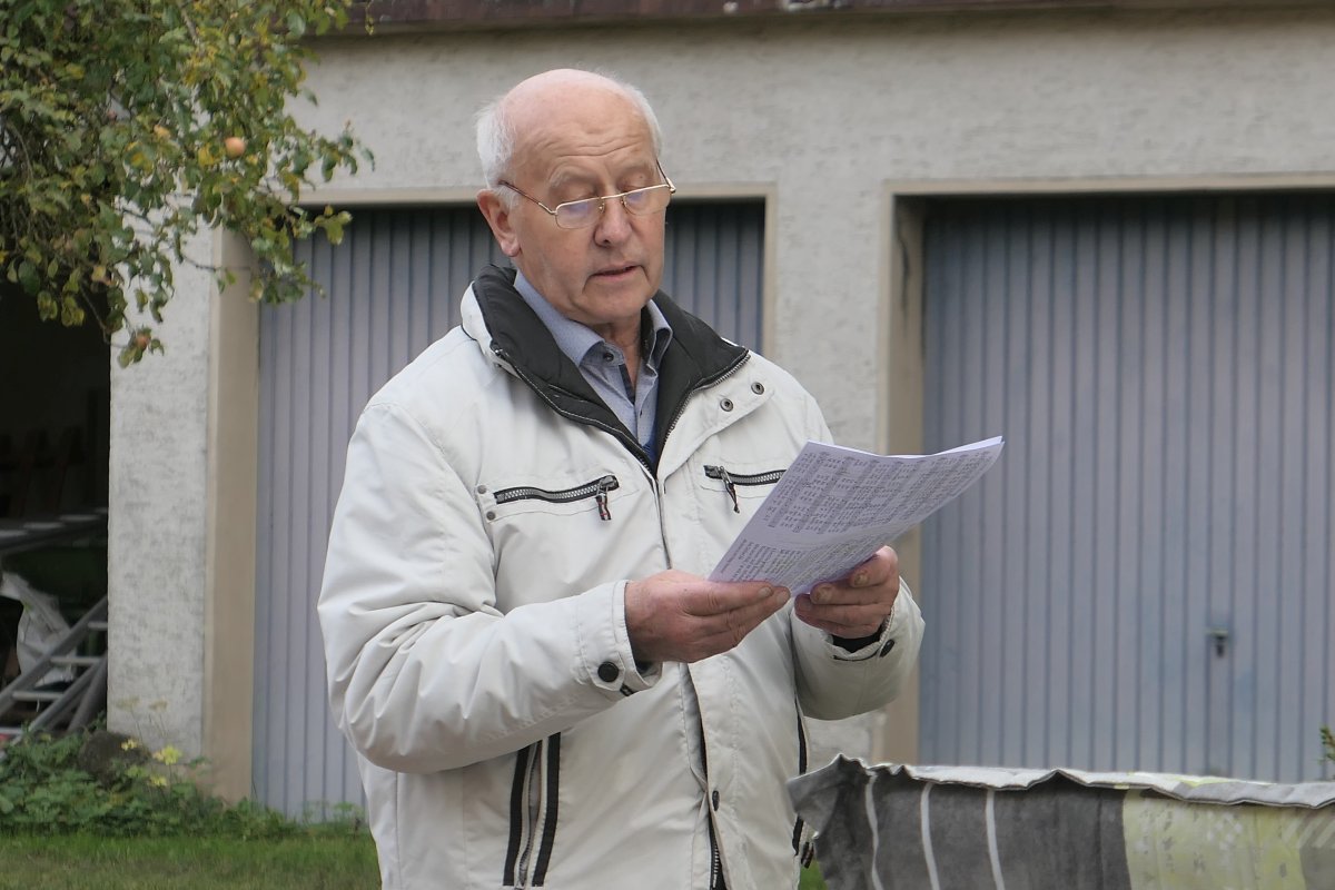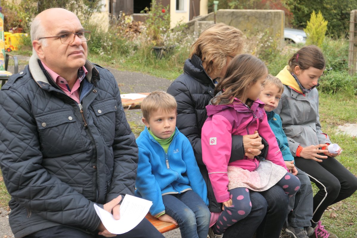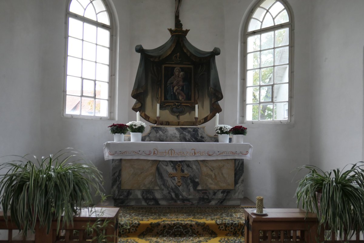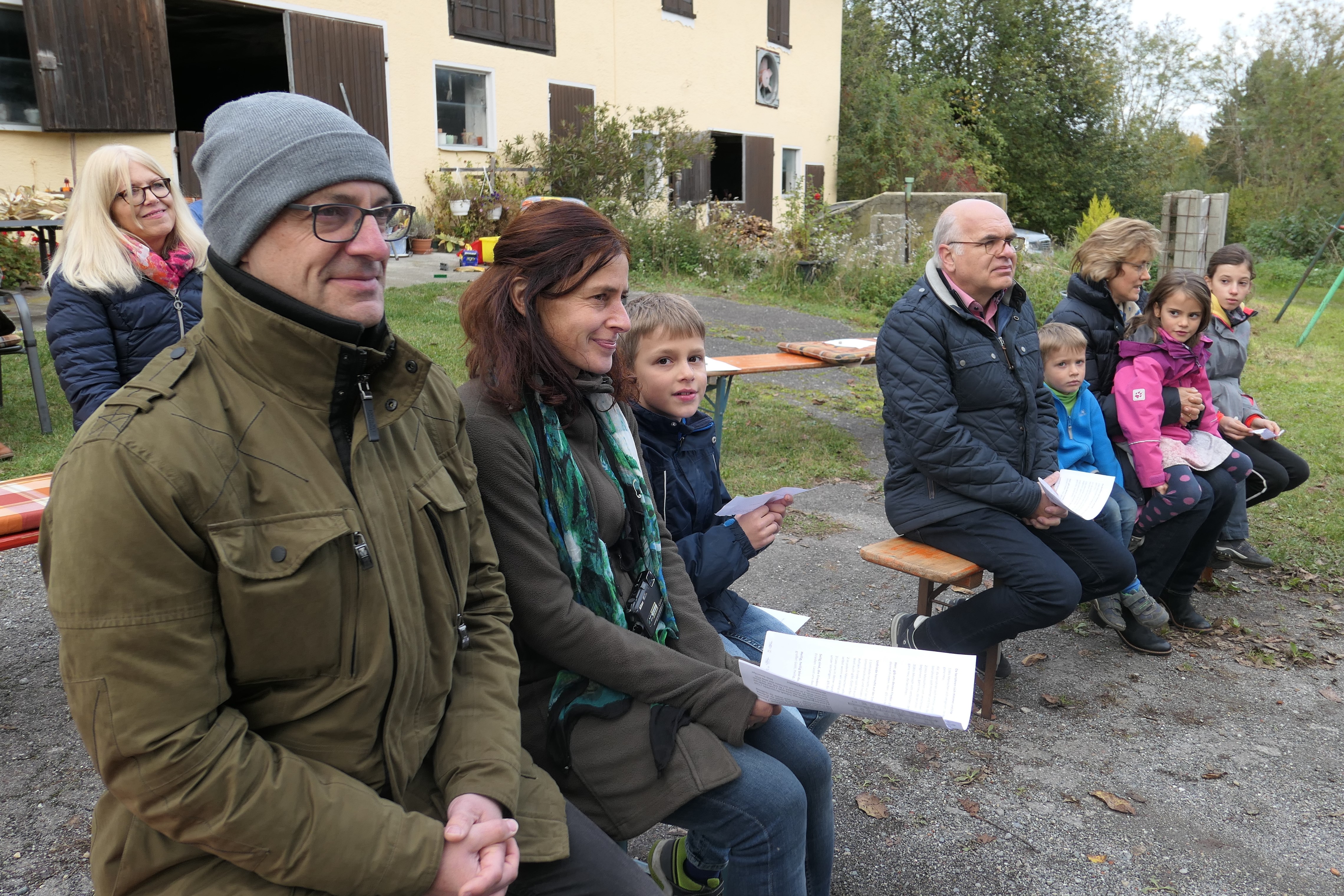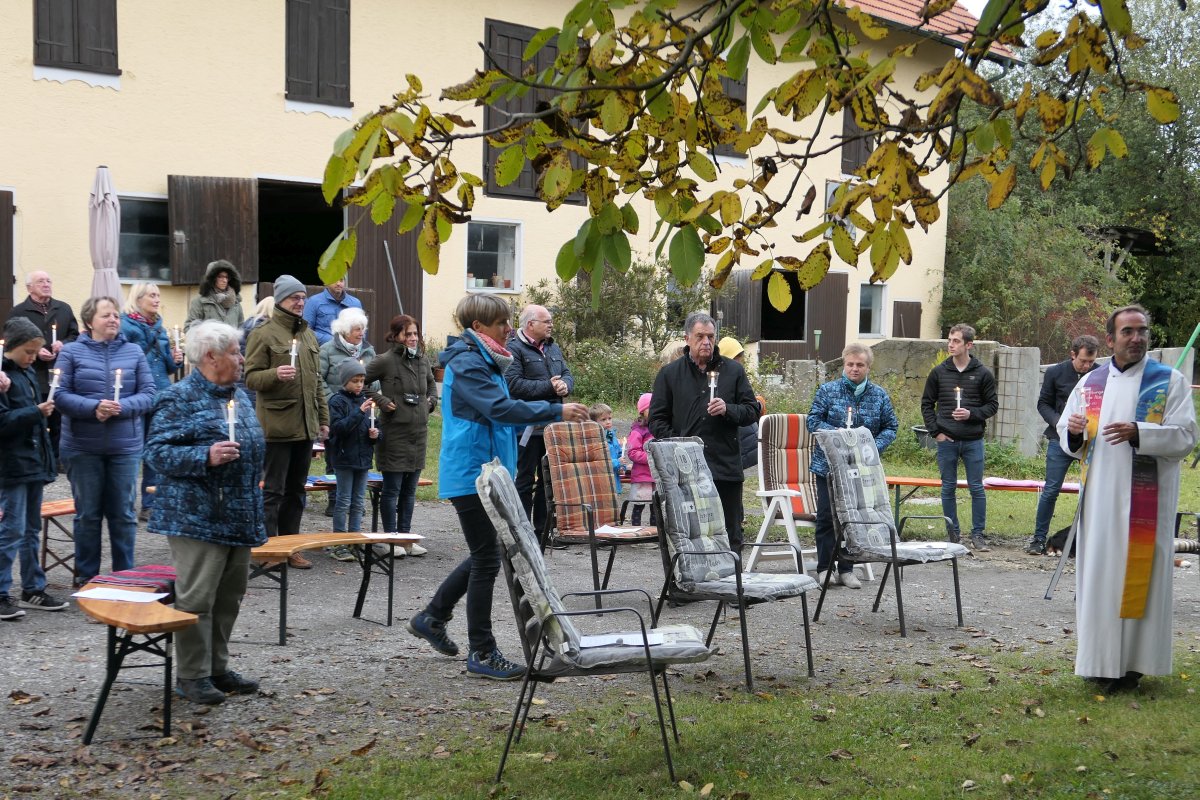 Bei angenehmer Herbsttemperatur fanden sich am frühen Sonntagabend gut 40 Gläubige im Tobelweg bei der Großfamilie Schmid ein. In ausreichendem Abstand standen genügend Sitzgelegenheiten zur Verfügung. Den Altar unter einem mächtigen Nussbaum schmückte neben herrlichen Blumen das Bild der „Der Pilgernden Gottesmutter von Schönstatt“. Seit dem Jahr 2011 ist diese, in Brasilien vor einigen Jahrzehnten initiierte Kampagne auch in Kümmerazhofen lebendig. Schnell fand hier Heidrun Schumacher acht Familien, welche dieses Bild jeweils vier Tage im Monat zu Hause aufnehmen und betend verehren. „Pilgern ist in“, mit diesem Satz eröffnete Pfarrer Werner den Gottesdienst. Dabei erinnerte er natürlich auch an die Selige Gute Beth von Reute, deren sechshundertster Todestag dieses Jahr am 25. November gefeiert werden kann. „Pilgern bringt unterschiedlichste Menschen zusammen, Vertraute und Fremde, Arme und Reiche, Gesunde und Kranke, unerkannt ist Christus so unter den Menschen“, animierte der Prediger Die passenden Gottesdienstlieder begleitete Volker Schumacher mit seiner Gitarre routiniert.