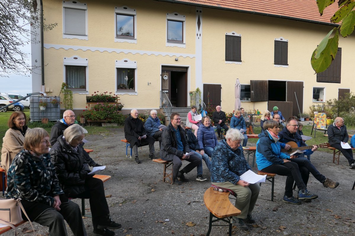 Seit einigen Jahren wird in Kümmerazhofen das Kirchenpatrozinium feierlich begangen. Den Gründungstag der Schönstattgemeinschaft am 18. Oktober 1914 begehen hier die Gläubigen in der spätbarocken MTA-Kapelle in Dankbarkeit. Weil nach den derzeitigen Vorgaben in der über 150-Jahre-alten Kapelle nur der Platz für zwölf Personen möglich gewesen wäre, kam Kapellenmesner Josef Schmid die pfiffige Idee: „Wir feiern das Patrozinium unter freiem Himmel, dazu bietet sich mein Hofraum ja prächtig an. Den Festaltar bauen wir dann in meinem großen Gartenpavillon auf“. Diese Idee kam bei Pfarrer Stefan Werner glänzend an, spontan ergänzte er den Vorschlag des Mesners: „Aber dann gibt es nach dem Gottesdienst eine kleine Wallfahrt zur Kapelle in Ortsmitte“.