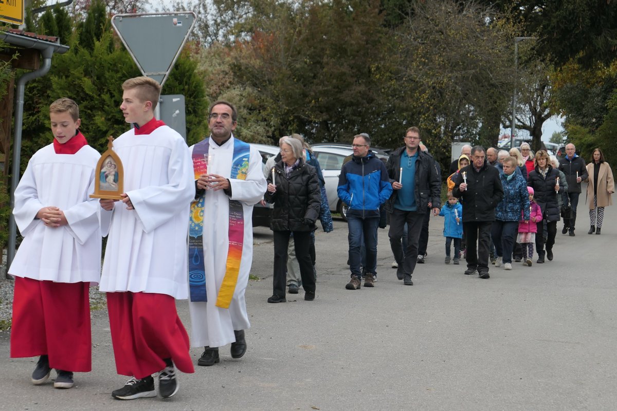 Zur Prozession bei beginnender Dämmerung erhielten die Teilnehmer Kerzen. Betend und singend zogen die Gläubigen zur Dorfkapelle, welche im Jahr 1863 erbaut wurde. Ursprünglich der Guten Beth geweiht, wurde im Jahre 1940 in den Nöten des Zweiten Weltkriegs auf Initiative des damaligen Pfarrers Eugen Schmidt die Kapelle der Schönstatt-Muttergottes gewidmet. Das Altarbild „Mater ter admirabilis (MTA) - Dreimal Wunderbare Mutter - stellt das Gnadenbild der Wallfahrtskapelle von Schönstatt dar. Mit dem Segen des Pfarrers und dem Lied „Ich gehe, wenn ich traurig bin, zur lieben Muttergottes hin“ endete das festliche Patrozinium.