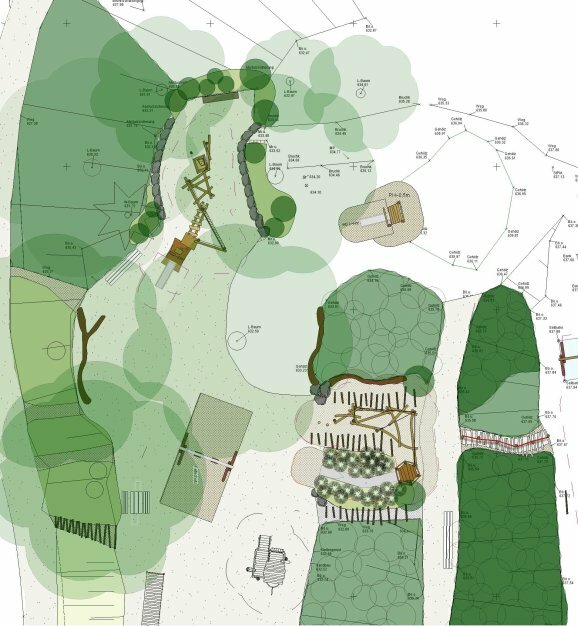 Unter der alten Buche wird eine Kleinkinderspielkombination mit Spielhäuschen sowie Kletter- und Balancierangebot eingebaut. Eine weitere Rutsche ergänzt das Spielangebot im Wald. Zudem wird die vorhandene Doppelschaukel durch eine neue Schaukelanlage ersetzt. Alle neuen Geräte bestehen aus naturkrummen Robinienhölzern aus nachhaltigem Anbau und wurden speziell für diesen Waldspielplatz entworfen. Zu den vorhandenen Bänken wird eine zusätzliche Tischgruppe eingebaut. Die Maßnahme wird dieses Jahr noch vollständig abgeschlossen und freigegeben, vorausgesetzt das Wetter eignet sich dafür. Die weiteren Spielgeräte in der unteren Ebene wie die Sandspielkombination, Drehschaukel, der Balancier- und Klettersteg sowie die Wippgeräte und das Karussell bleiben vorerst erhalten. Sie werden im zweiten Bauabschnitt durch einen anspruchsvollen Klettermotorikparcours mit Spieltürmen für Kinder und Jugendliche, ebenfalls aus Robinienholz, ersetzt.