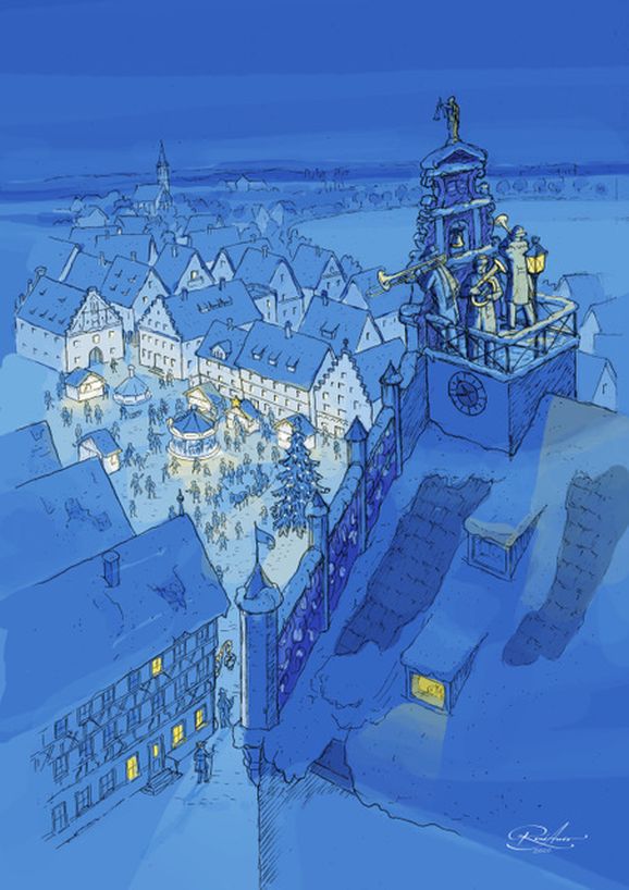 Das Titel-Motiv des diesjährigen Stiftungskalenders entstammt erneut der Feder des Waldseer Künstlers René Auer, der damit an eine frühere Waldseer Tradition zu Weihnachten erinnert. Beim sogenannten Turmblasen hat Auers Vater regelmäßig seine Zugposaune gespielt.