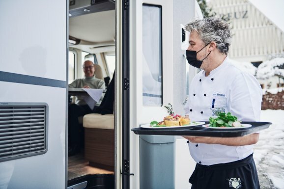 Nicht nur in der Haupt-Urlaubszeit erweisen sich Reisemobile als besonders krisensicher. So bieten im derzeitigen Teil-Lockdown immer mehr Restaurants mit geeigneten Parkmöglichkeiten ein Abend- oder Mittagessen im Reisemobil an. Die Idee dahinter: Die Reisemobilisten bekommen ihr Menü nicht als Take-