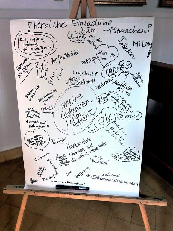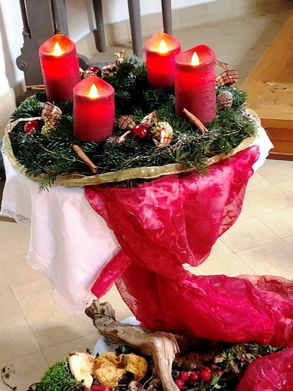 Betritt man dann die Kapelle, kommen die Besucher nicht mehr aus dem Staunen heraus. Gleich nach dem Eingang auf der linken Seite weisen Plakate auf die Aktion der Landfrauen Haisterkirch-Mittelurbach hin. Die Landfrauen hatten bekanntlich in allen sieben geöffneten Kleinkirchen und Kapellen des Haistergaus (für die 8. Kleinkirche in Osterhofen besteht bekanntlich Zutrittsverbot) zu einem „Adventsweg“ der besonderen Art und zum Mitmachen eingeladen.