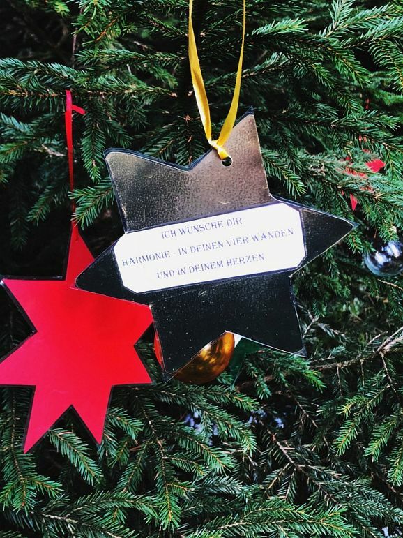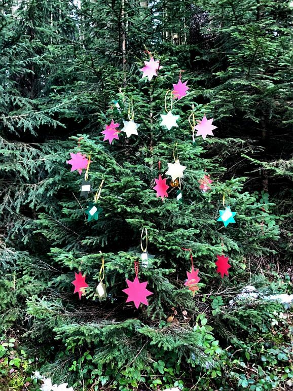Geht man den stets ansteigenden Weg weiter, so entdeckt man insgesamt weitere sieben mit unterschiedlichstem Schmuck versehene Bäumchen. Da hängen auch beschriftete Sterne daran mit wertvollen, Mut machenden Impulsen für den Alltag. Auf der linken Seite (beim Hinaufgehen) wurde gleich eine ganze Gruppe von fünf Bäumchen weihnachtlich dekoriert. Die anonymen Bäumchenverzierer verbindet eines, sie wollen eben anderen Menschen Freude bereiten.