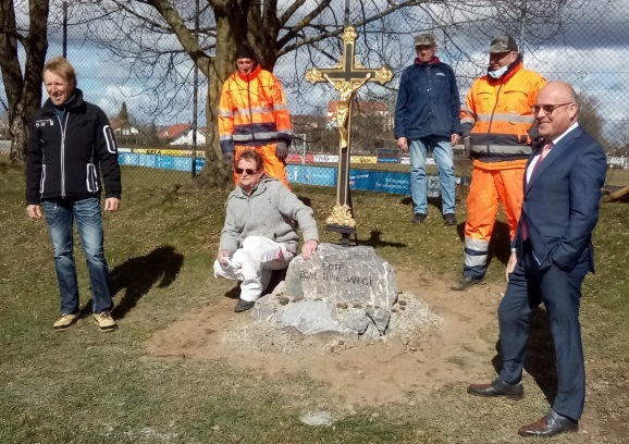 Der Standort wurde auf die andere Straßenseite verlegt. Die Mitarbeiter des Bauhofes – für Konrad Miller war es die letzte Amtshandlung vor dem wohlverdienten Ruhestand – hatten einen mit der Inschrift „Gott segne deine Wege“ versehenen, von Paul Kessler gestifteten, Naturstein verlegt und setzten das mit viel Können erneuerte Kreuz ein.