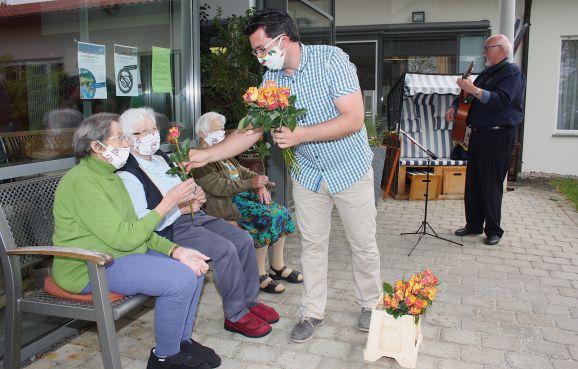 Mit roten Rosen und einem gemeinsamen Singen hat Heidi Schreiber am Muttertag die Bewohner des Pflegeheims Wohnpark am Schloss überrascht. Die Freude über diese Aufmerksamkeit und die Gitarrenmusik von Alwin Linne waren groß. Die Senioren stimmten freudig ein in bekannte Lieder wie „Sag Dankeschön mit roten Rosen“. Daran hinderte sie auch der Mund-Nasen-Schutz nicht, den sie als Vorsichtsmaßnahme trugen.