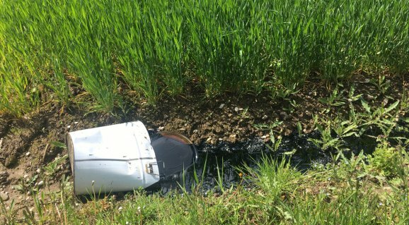 Bad Waldsee - „Bah, da stinkt’s nach Benzin!“ Und tatsächlich, direkt in der ersten Ackerfurche liegt ein offener Eimer, aus dem eine schwarze, dicke Brühe wie Altöl ausläuft und schon 10 Meter in die Ackerfurche geflossen ist.