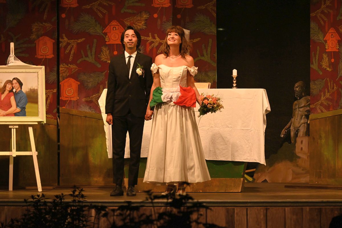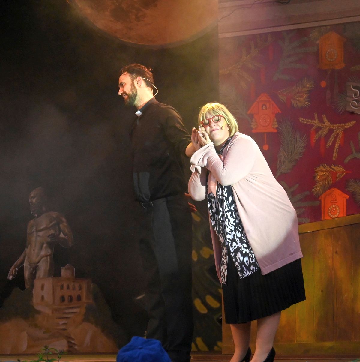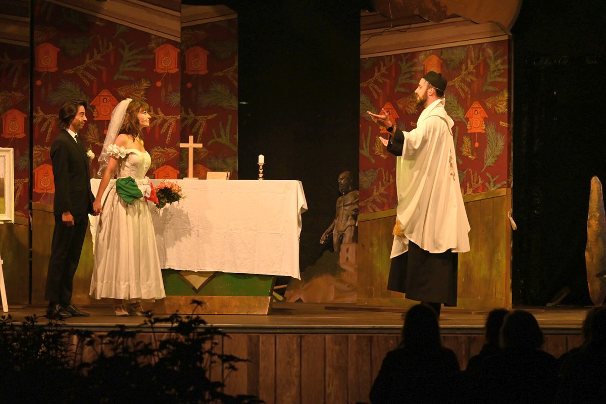 Der Plott bietet ideale Voraussetzung für alle Klischees, die Ingmar Otto mit viel Witz in das Stück hineingearbeitet hat. Die spießigen Deutschen, die mit ihren Tauben als Geschenk anreisen. Hinreißend die Szene, in der die Schwiegermutter in Spe eine tote Taube einfach mal so über die Schulter in die Kulisse entsorgt. Oder der Pfarrer, der es versteht, den Bräutigam zu einer großzügigen Spende für die fehlenden Glocken seiner Kirche zu nötigen und der dann nach einem Techtelmechtel mit der Hochzeitsplanerin sein Messgewand an denn berühmten Nagel hängt und in Liebe mit seiner Gloria entschwindet.
