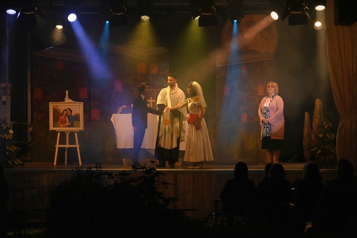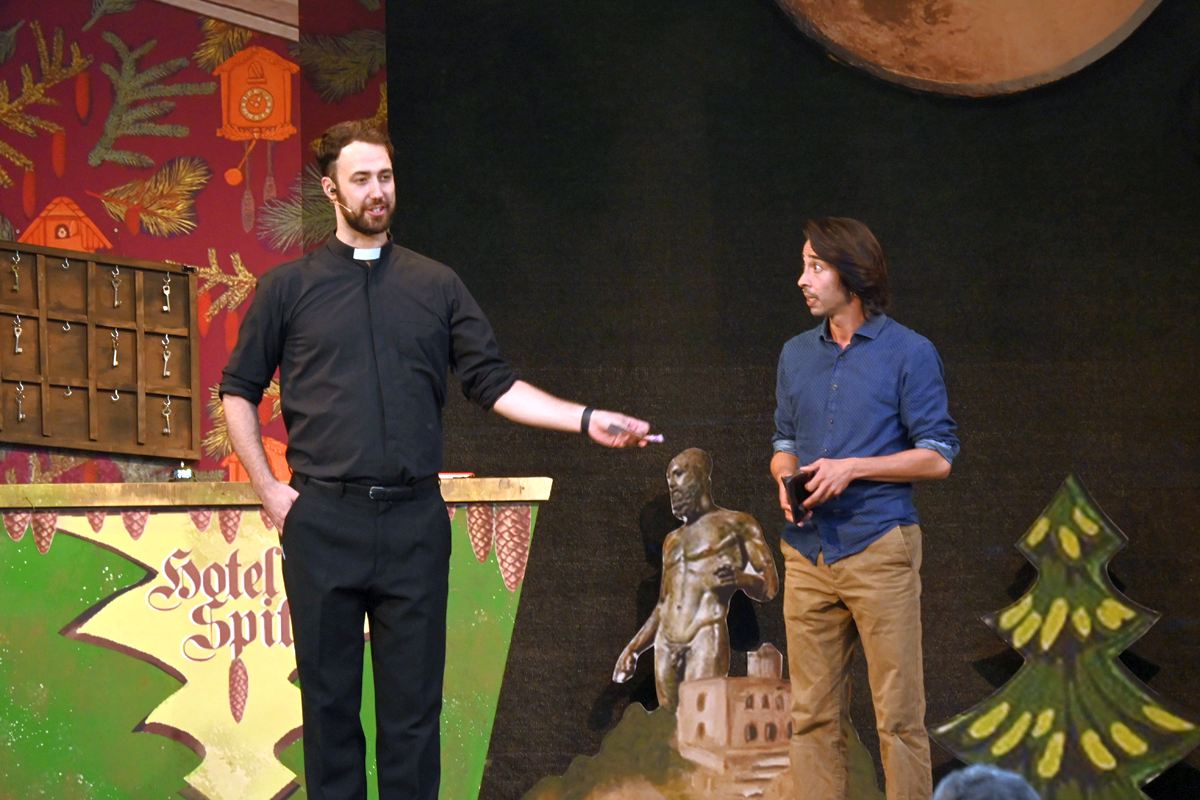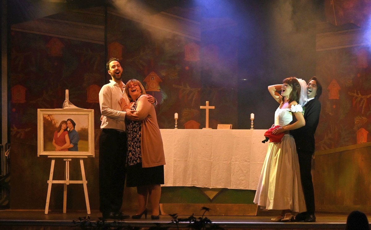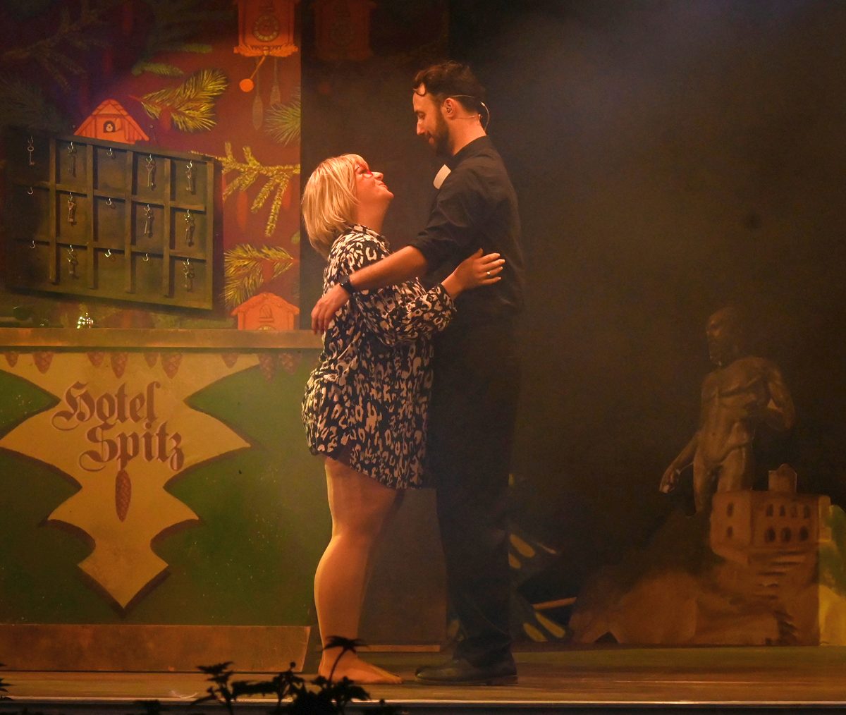 Der Plott bietet ideale Voraussetzung für alle Klischees, die Ingmar Otto mit viel Witz in das Stück hineingearbeitet hat. Die spießigen Deutschen, die mit ihren Tauben als Geschenk anreisen. Hinreißend die Szene, in der die Schwiegermutter in Spe eine tote Taube einfach mal so über die Schulter in die Kulisse entsorgt. Oder der Pfarrer, der es versteht, den Bräutigam zu einer großzügigen Spende für die fehlenden Glocken seiner Kirche zu nötigen und der dann nach einem Techtelmechtel mit der Hochzeitsplanerin sein Messgewand an denn berühmten Nagel hängt und in Liebe mit seiner Gloria entschwindet.