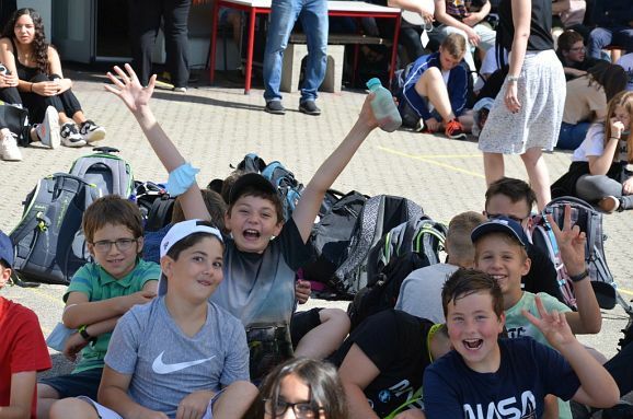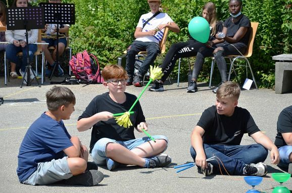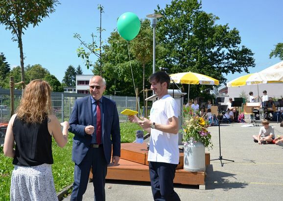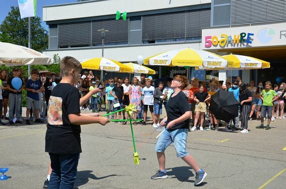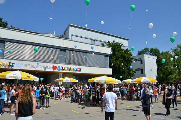 Die kurzweilige Moderation des Festakts hatte Konrektorin Diana Criste übernommen. Für den unterhaltsamen Rahmen sorgten mit einem Song (Klasse 5b und Elias, Klasse 10b), die Bläserklasse 6a mit „ Ode an die Freude“, „School Spirit“, „Happy Birthday“ sowie mit einer spontanen Zirkusnummer die drei Jonglierkünstler der Klasse 6c. Gerade die mitwirkenden Schüler ernteten besonders viel Applaus. Zum Abschluss wurden noch 50 umweltgerechte Luftballons in die Höhe gelassen. Diese entschwebten schnell hinweg über dem Schulzentrum ins blaue Firmament.