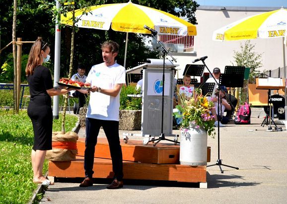 Bei angenehmen Temperaturen nahmen die Schülerinnen und Schüler klassenweise sitzend unter den aufgestellten Sonnenschirmen im Schulhof und im Schatten des Schulgebäudes Platz. Sie verfolgten diszipliniert und gespannt das Geschehen um diese Geburtstagsfeier, die nur in reduzierter Form geboten werden konnte. Die Corona-Pandemie ließ es nicht zu, dass die dreitätig geplanten Feierlichkeiten, gedacht auch für ehemalige Schulangehörige, durchgeführt werden konnte.