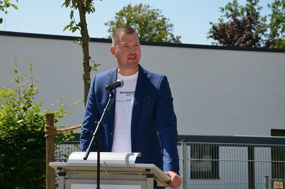 Bürgermeister Matthias Henne betonte, dass die Stadt gerne in Schule und Bildung investiere und er persönlich heute voller Stolz das Realschul-T-Shirt mit dem Aufdruck „Zusammen zum Ziel“ trage.