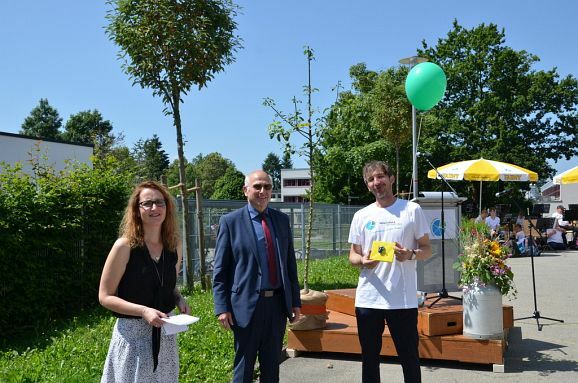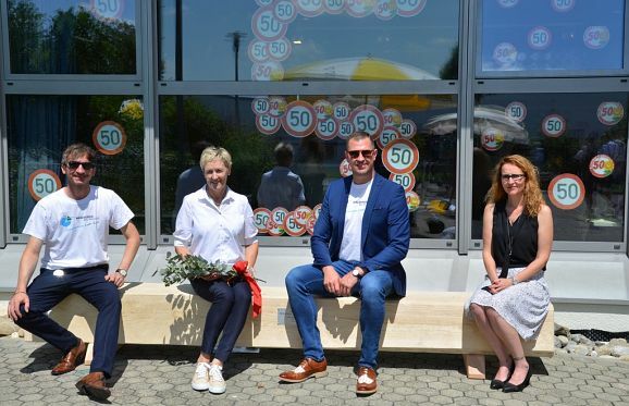 Auch ein Geschenk der Stadt war mitgebracht worden. Eine neue Bank direkt beim Eingang aufgestellt, soll ein Symbol für Nachhaltigkeit und Beständigkeit sein. Angefertigt wurde die Bank von einem örtlichen Schreiner aus Holz des Stadtwalds.