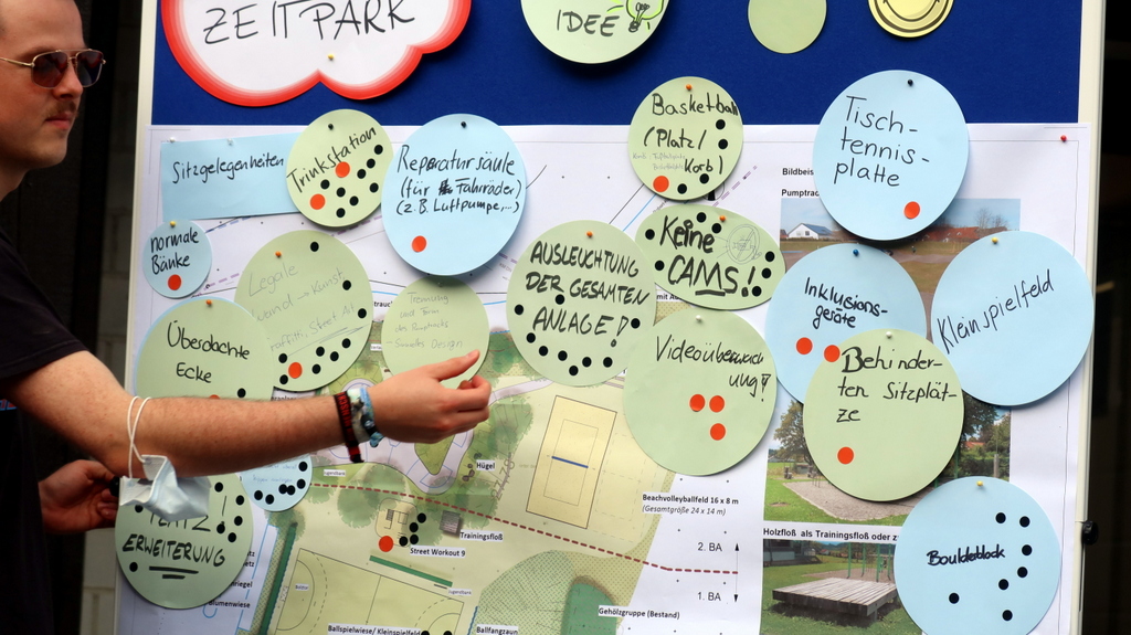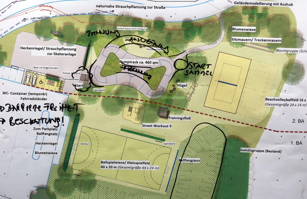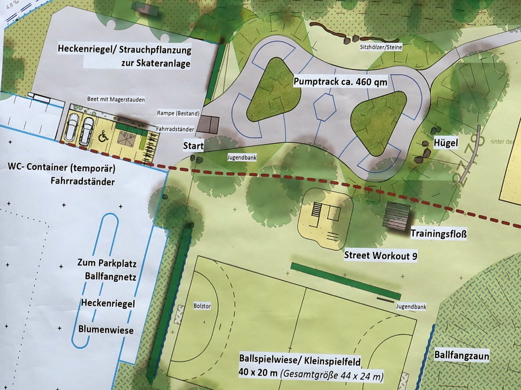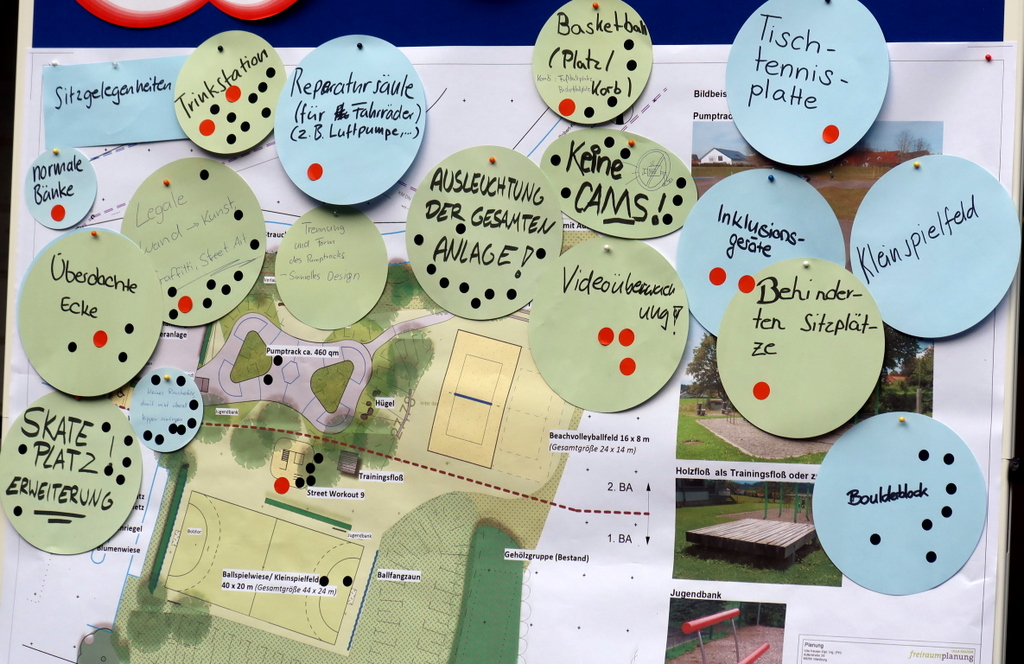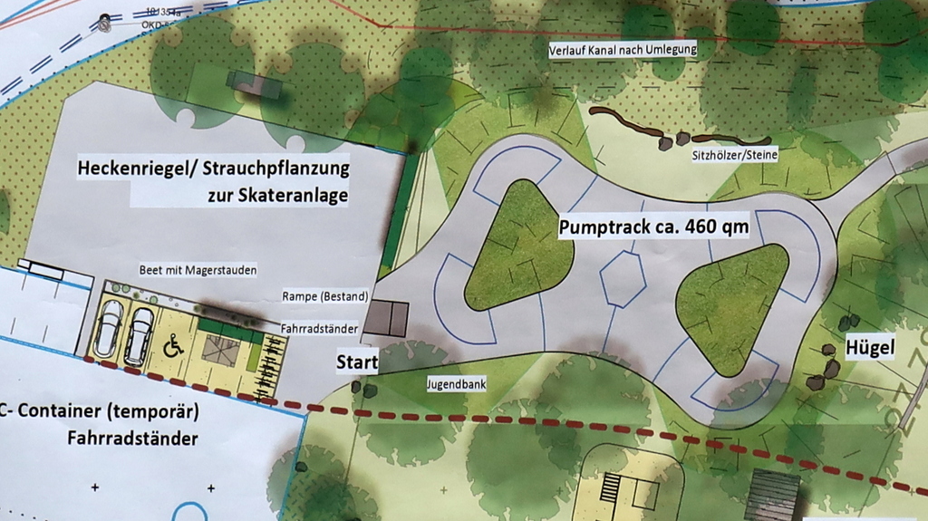 Eine ganze Reihe von Anregungen ergänzten den städtischen Planungsvorschlag. Die anschließende Bepunktung durch die Teilnehmer ergab folgende Wertung: Trinkstation mit 10 Punkten, Legale Wand für Kunst, Graffiti, Street-Art auch 10 Pkt., Ausleuchtung der gesamten Anlage mit 9 Pkt., Keine Cams (Überwachungskameras) mit 8 Pkt., Eine kleine Raucherecke, damit nicht überall Kippen herumliegen ebenfalls mit 8Pkt., Boulderblock (Klettervorrichtung) mit 7Pkt., Skater-Platz Erweiterung mit 6 Pkt., je 5 Punkte gab es für einen Basketball-Platz/Korb und den für Street Workout -Platz, für alle anderen Vorschläge, so auch für eine Videoüberwachung, gab es weniger Punkte. Diskussionsbeiträge gab es zum vorgesehenen Pumptrack, denn hier wurde angeregt, eine klare Abgrenzung zur bestehenden Skateranlage vorzunehmen.