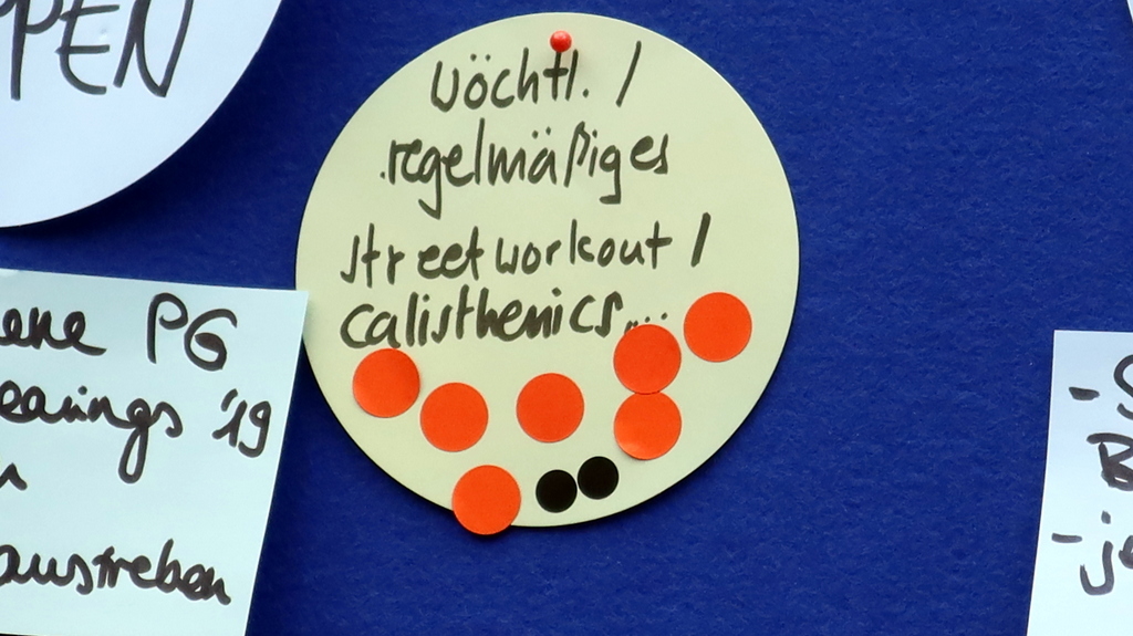 Für eine ständige Jugendvertretung in Form eines Jugendparlaments stimmten eine deutliche Mehrheit mit 29 Stimmen und ebenso mit 29 Stimmen möchte sich „Area 339 Kollektiv“ als Projektgruppe einbringen. Als weitere Projektgruppe möchten sich regelmäßig 9 Teilnehmer bei Street Workout/ Calisthenics (Geräteturnen/Akrobatik) einbringen. Auch für eine Inklusive Sportgruppe (z. Bsp. Fußball-Kleinspielfeld) stimmten 9 Gruppenmitglieder.