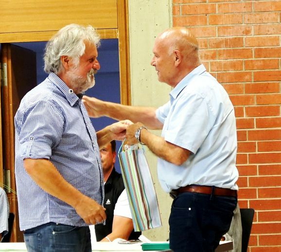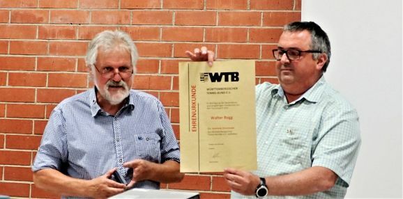 Prasselnden Applaus erntete am Schluss Walter Rogg, als ihn der neue Abteilungsleiter Uli Hörmann im Auftrag des WTB (Württembergischer Tennis-Bund) mit Ehrenurkunde und Ehrennadel in Bronze auszeichnete. Mit der Überreichung eines Geschenkkorbs und einer wahren Lobeshymne auf Walter Rogg würdigte die stellvertretende Abteilungsleiterin Toni Kucznierz dessen hohes Engagement für den Haisterkircher Tennissport. Als besondere Eigenschaften in Bezug auf seinen Nachnamen ROGG stellte Toni heraus, dass Walter immer ein Garant für Richtung, Optimismus, Gewissenhaftigkeit und Geradlinigkeit war.