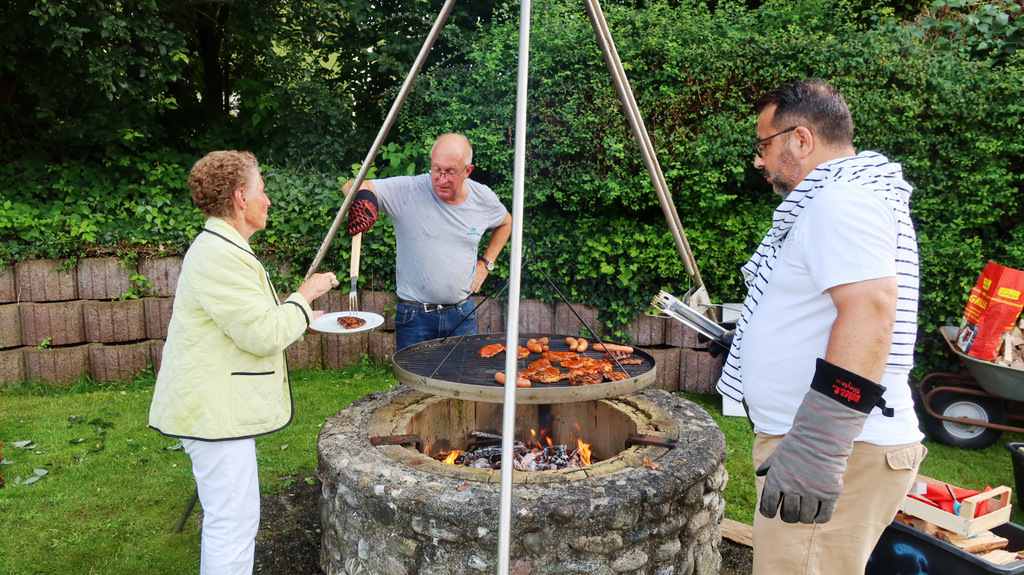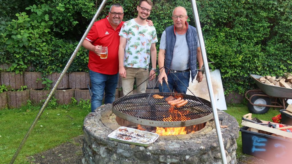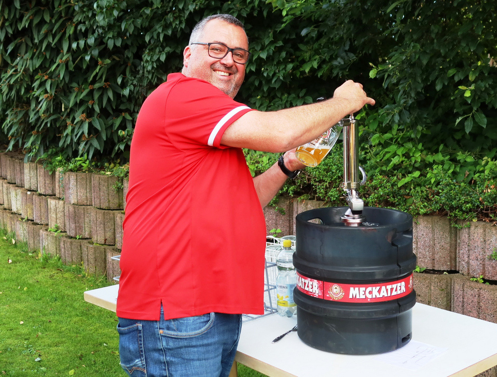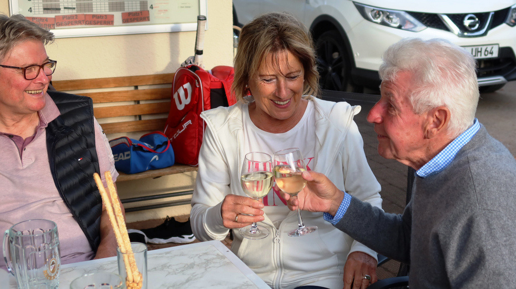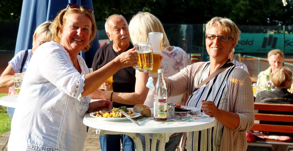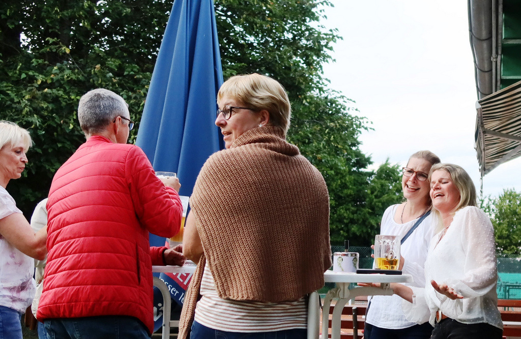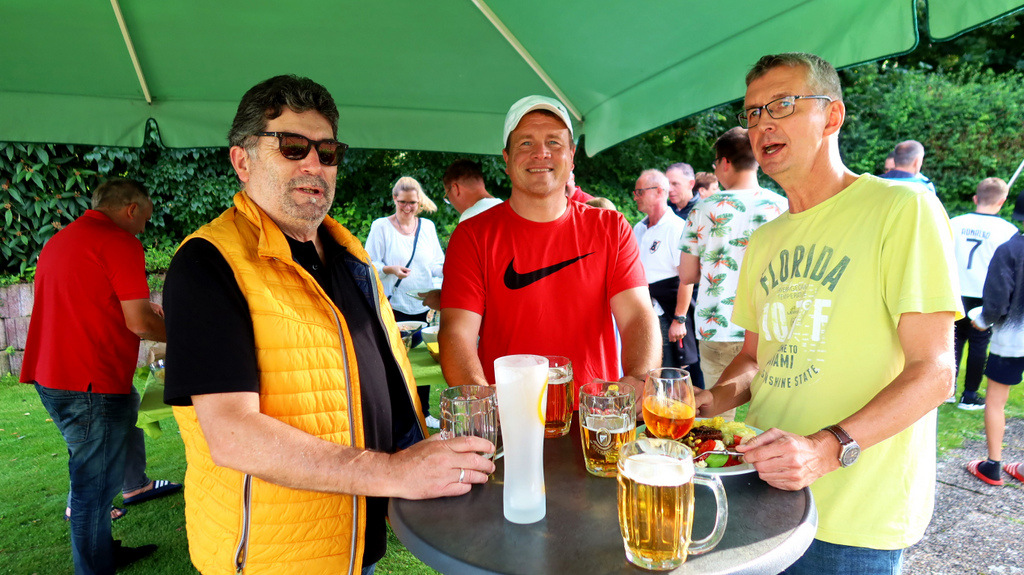 Schließlich wollte man dieses sportliche Ereignis ausgiebig feiern mit einem kulinarischen Angebot vom Feinsten (große Auswahl gespendeter Salate zum Grillgut und dazu leckere Nachspeisen) und natürlich Getränke aller Art. Eingeladen waren auch die Fans der Herren 50 und die kamen in großer Anzahl.