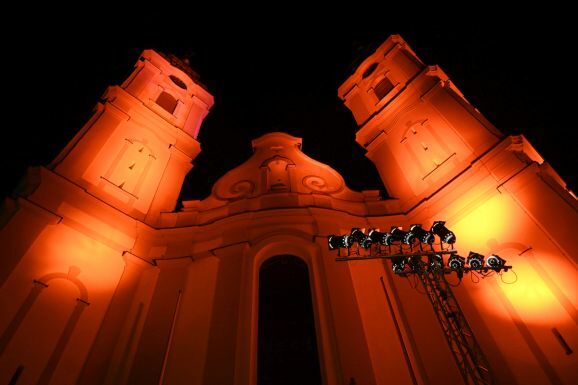 Unser Rundgang beginnt am Gut-Beta-Platz. Orangerot erhebt sich die beeindruckende Fassade der Stiftskirche Sankt Peter mit den beiden mächtigen, über Eck gestellten Türmen in den schwarzen Nachthimmel. Die Lichterführung hebt jeden Absatz und jeden Schnörkel, die sich die alten Baumeister ausdachten und die Stuckateure in Szenen setzten, besonders plastisch hervor.