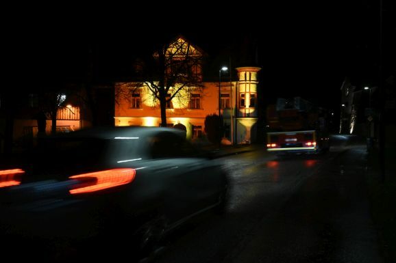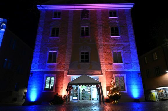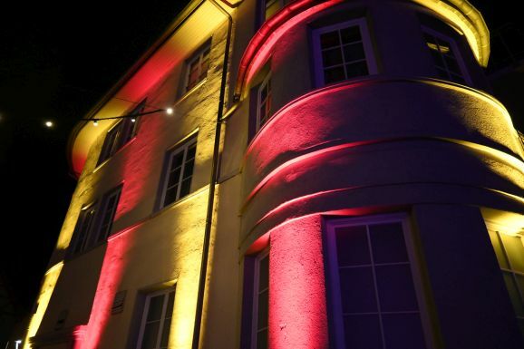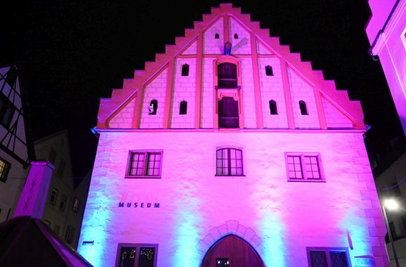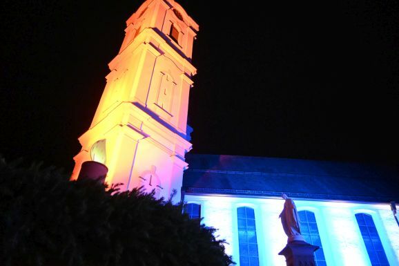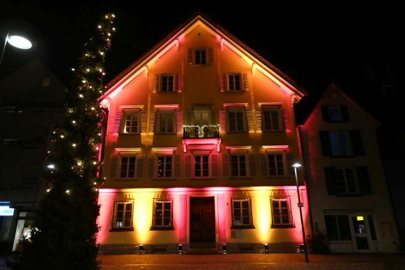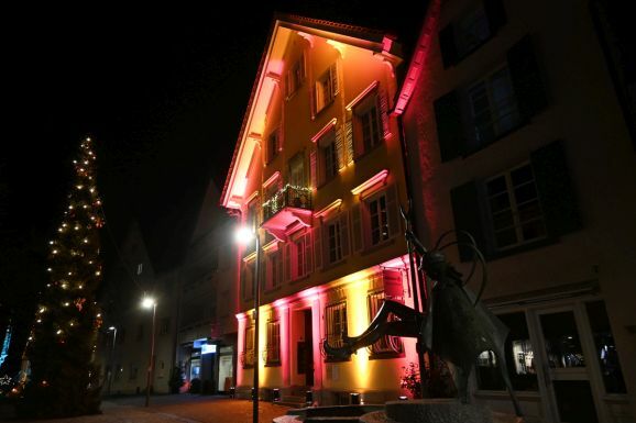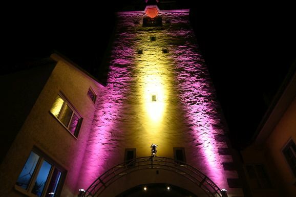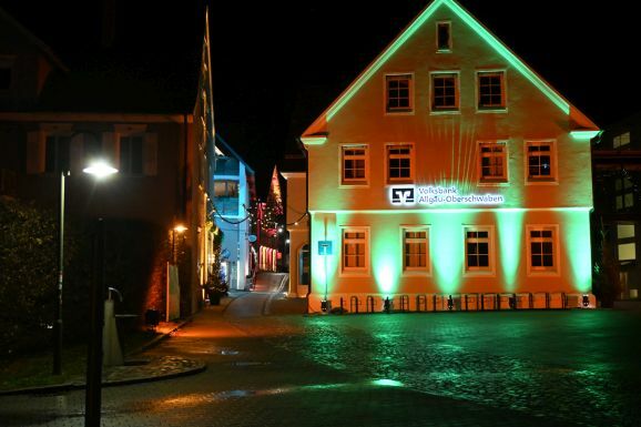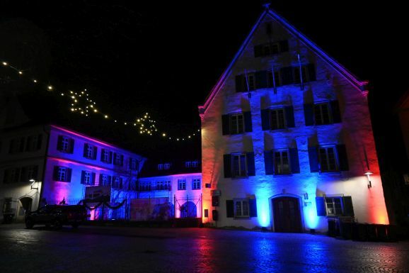 Bad Waldsee - Wenn es dunkel wird in Bad Waldsee lohnt sich ein Spaziergang durch die Innenstadt ganz besonders. Viele öffentliche und private Gebäude erstrahlen im Glanz bunter Scheinwerfer. Rote, blaue, grüne Lichter geben den Gebäuden völlig neue Akzente.