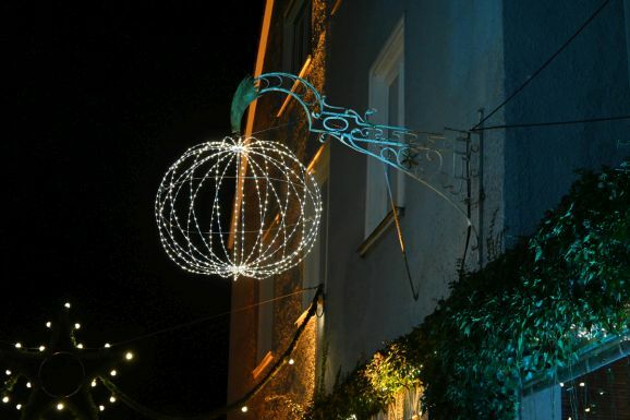 Die Volksbank am zukünftig wichtigsten Eingang zur Innenstadt hat sich für ein kühnes Türkis entschieden. Gegenüber bei Wieland schimmert geheimnisvolle Weihnachtsbeleuchtung durch die Hecke, und die Krone über der Ladentür blitzt immer wieder hell auf.
