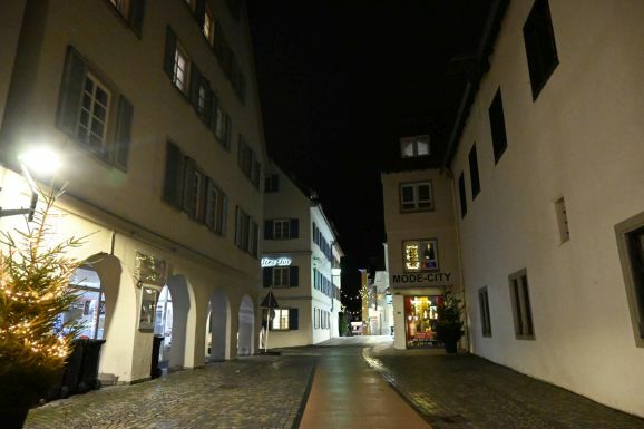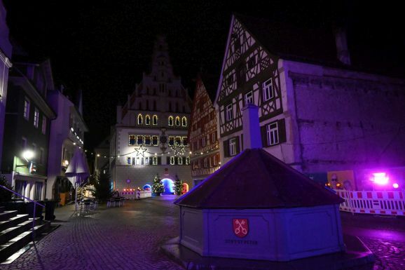 Bad Waldsees Vorzeigeplatz am Rathaus zeigt sich Baustellen geschädigt. Die Rathausfassade wird mit nur einem Spot angestrahlt, vielleicht um die romantischen Fenstereinfassungen nicht zu überstrahlen. Dafür bekommt das Museum den vollen Lichterglanz.