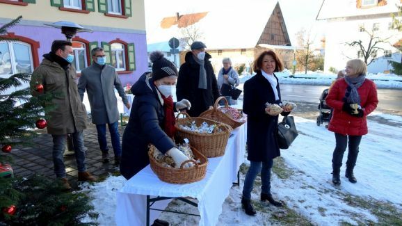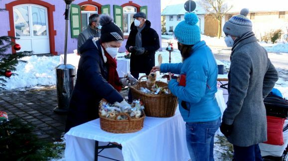 Angeboten wurden Herbert Eiseles Dosen mit deftigen Gulaschsuppen, die in Kooperation mit Metzgermeister Klaus Frank (Reute) hergestellt worden waren. Selbstverständlich gehörten zum aktuellen Angebot auch eine Vielfalt von Weihnachtsplätzchen, die von etlichen Hausfrauen gebacken und gespendet worden waren. Rosa Eisele und Gertrud Härle-Ruther hatten in Heimarbeit die Plätzchen in 130 festlich dekorierte Tüten abgepackt. Zu dem Spendenangebot gehörten auch Dosenöffner und feine „Bänsch-Nudeln“ wie auch „Tonis Cantuccini“. Ab 10.00 bis 14.00 Uhr erfolgte die Verkaufsaktion.
